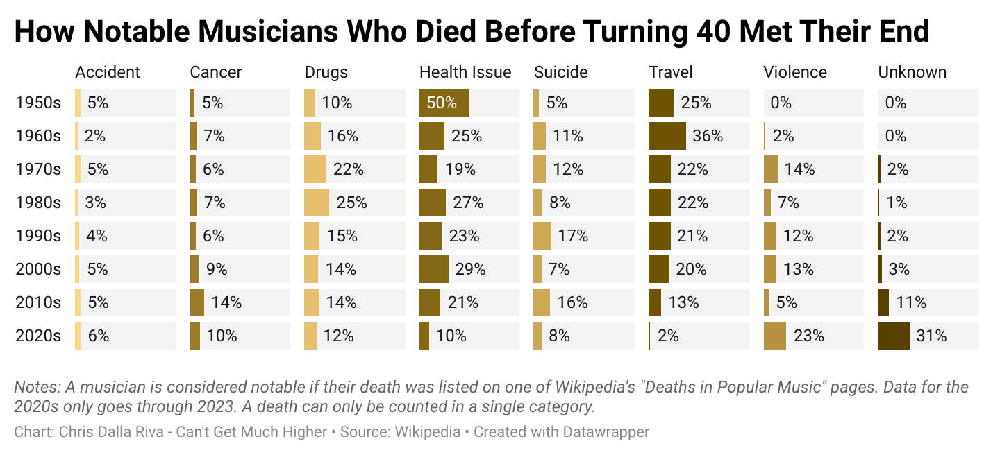 Musicians spend a ton of time on the road. That’s why there are scores of stories of prominent artists meeting their end while in a car or plane. In fact, in the 1960s, 36% of notable musicians who died before their 40th birthday, died while traveling. Over the last 15 years, that percentage has collapsed. Travel is just a lot safer these days. There are still too many artists dying prematurely, but it’s nice to see that it’s happening on the road less and less.