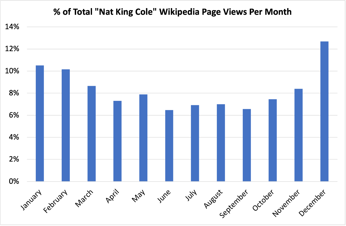Wikipedia page view data confirms this. Only 13% of Wikipedia "Nat King Cole" page views come in December. Even if we say the holiday season goes from November through January, 68% of Cole's page views are coming outside the holiday season.
