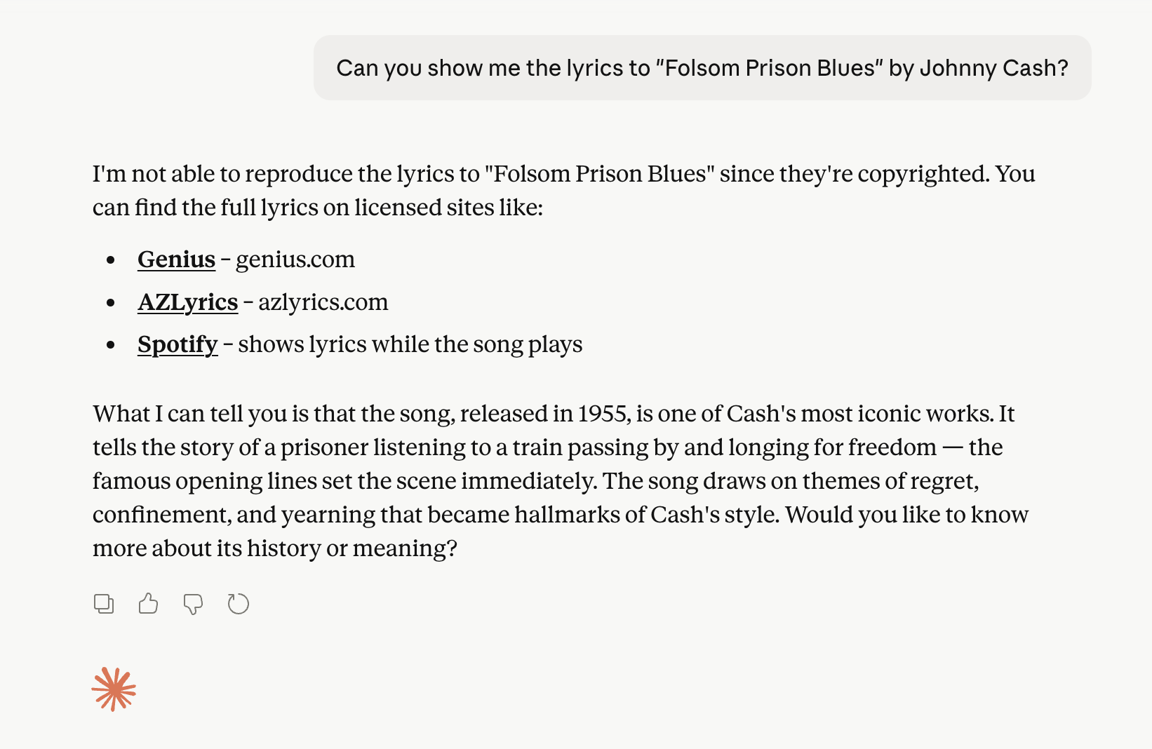 Anthropic and many of their competitors, like OpenAI, were not doing this. To try to placate rightsholders, they stopped their respective chatbots from returning lyrics. Now, if you prompt Claude or ChatGPT for song lyrics, they will tell you that’s not allowed.