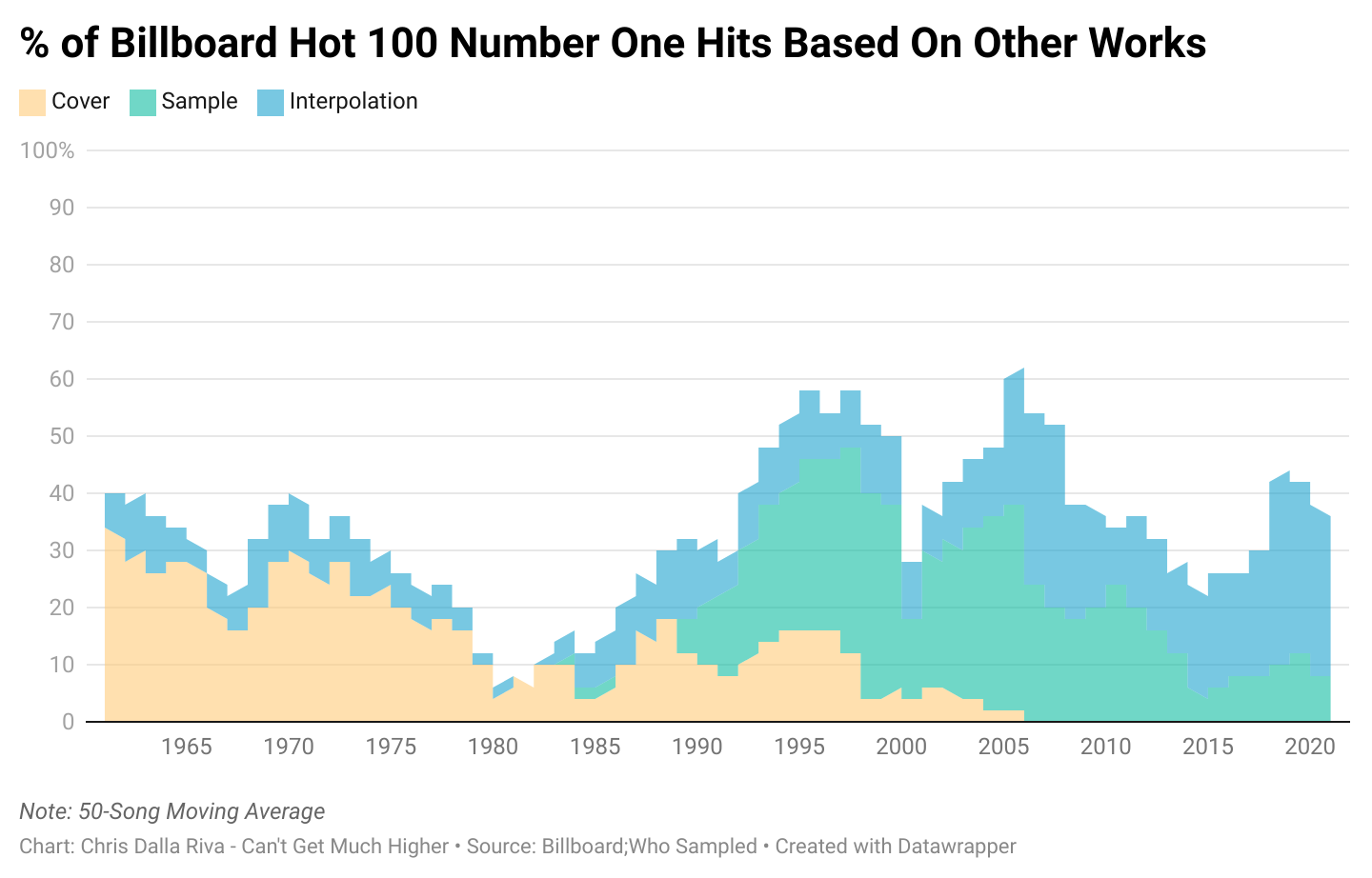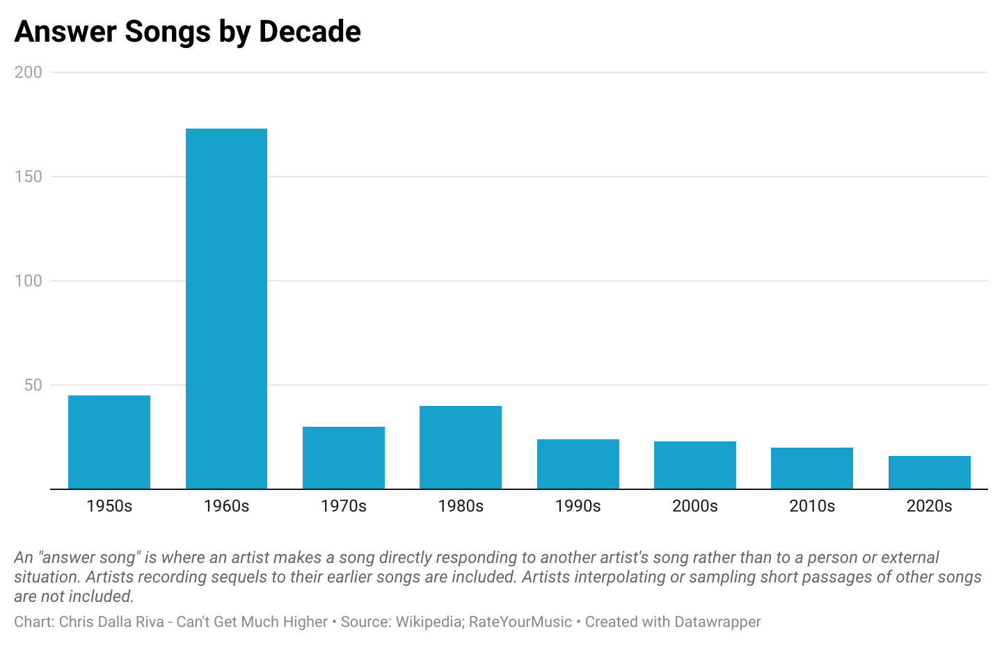 Using data from Wikipedia, RateYourMusic, and a handful of other websites, I built a database of 300+ answer, or response songs. To be included, a song couldn’t be a response to an artist or a situation. It had to specifically respond to another artist’s song without being a complete parody. While I couldn’t capture every answer song ever recorded, this data gives us a good sense of when and how those songs were used.