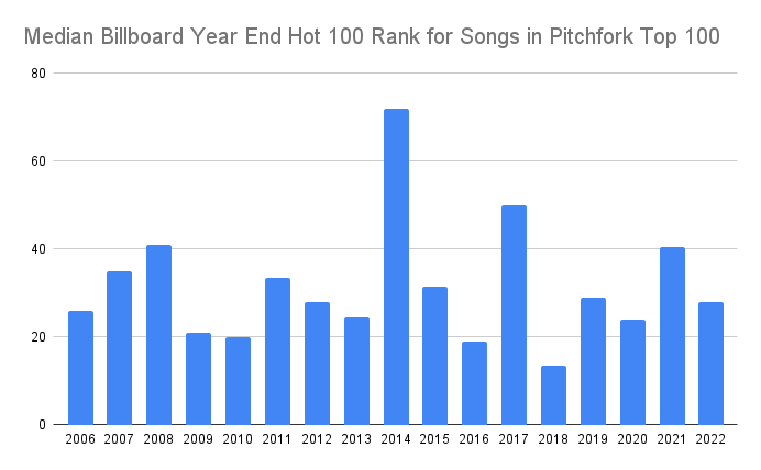 The other interesting thing about this chart is that it’s not really moving upward or downward over time. Critics, it seems, aren’t beginning to align with the public more or less frequently. Furthermore, Pitchfork isn’t suddenly including more popular songs. The median Billboard year end Hot 100 rank for songs in Pitchfork’s top 100 typically sits around 29.