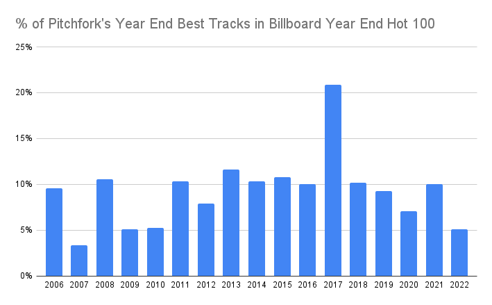 So, how often do Pitchfork and Billboard agree? Put another way, how often do critics agree with the general public? To measure this, I’ve taken Pitchfork’s annual top songs list from 2006 to 2022 and noted how often a song on their list (i.e., a critic’s choice) is also on Billboard’s list (i.e., the people’s choice).