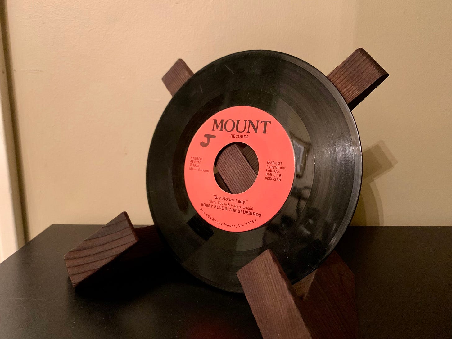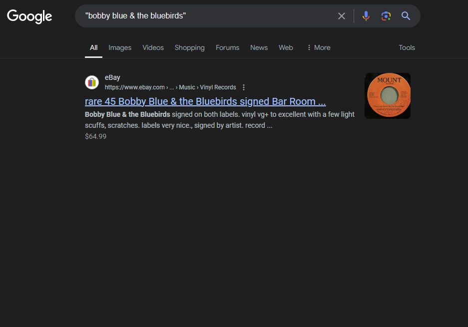 It was the summer of 2024 and I was going through my stack of 7” records when something caught my eye: a signed record I hadn’t noticed before. I don’t listen to 7” records often, and I could not remember how I acquired this one. The autograph’s presence, though, made me interested to learn more. I searched online for the artist name—“Bobby Blue & the Bluebirds”—and was confronted with exactly one result: an eBay listing for the same record I owned.