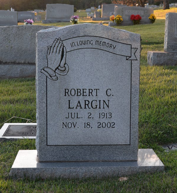 I soon came across a headstone for a “Robert Cushing Largin.” This man was born in 1913 in Dublin, Virginia, and died in 2002, in Roanoke, Virginia. It seemed possible that this could be my Bobby Blue.