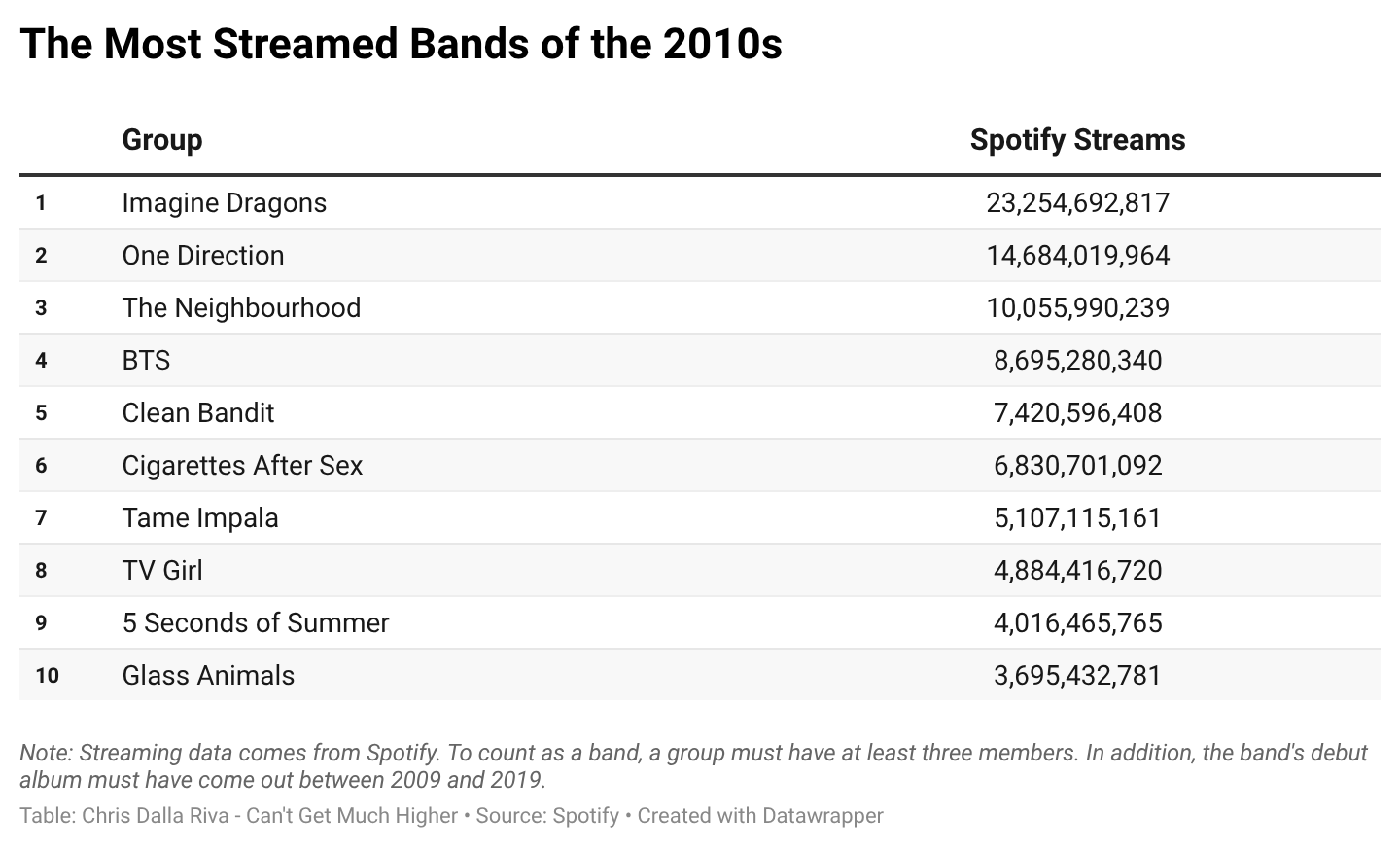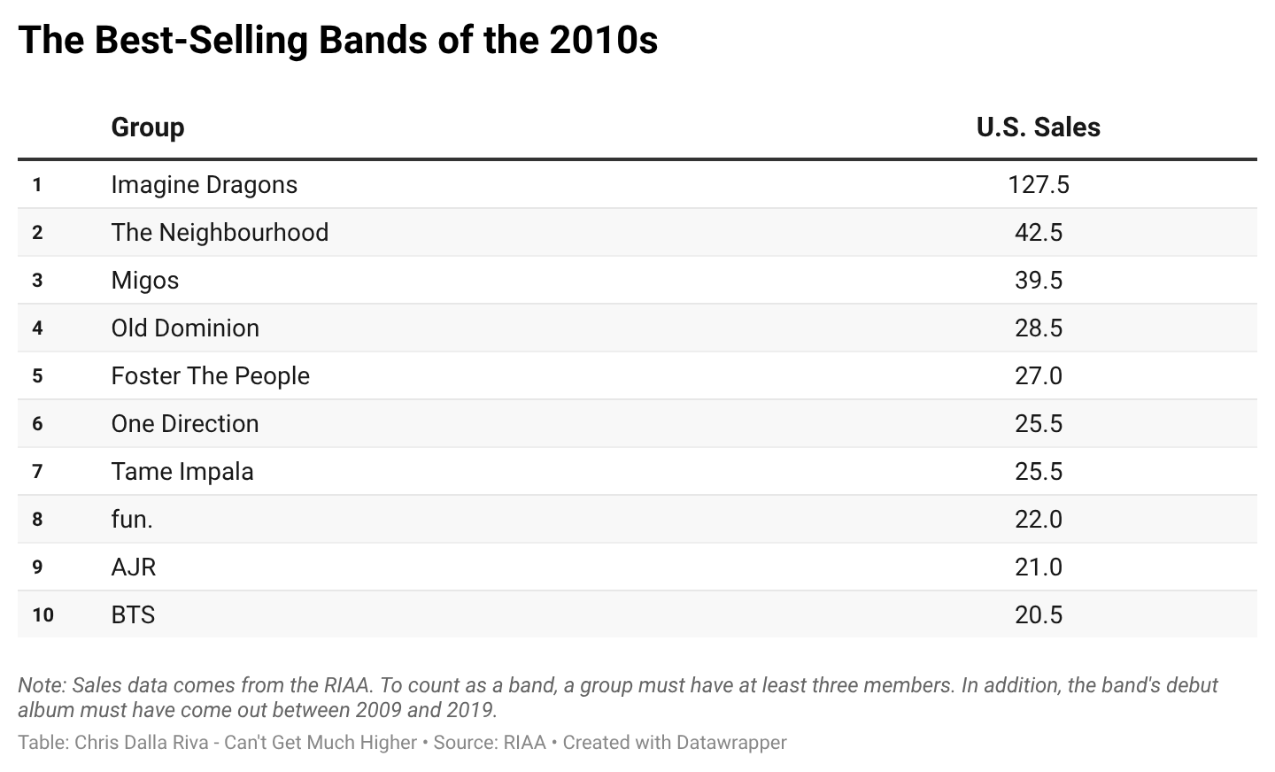 Let’s get a few things straight. First, we will define a band as any musical act with at least three members. That means rock-oriented duos of the 2010s, like Twenty One Pilots, won’t make the cut. Second, this definition is genre agnostic. If no members of the group play an instrument in the traditional sense, like the three family members in the rap troupe Migos, that is fine. Finally, the band’s first album must have come out between 2009 and 2019.