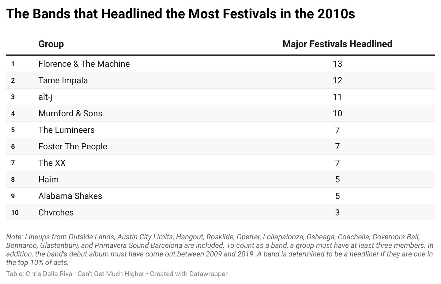 A few years ago, I aggregated a decade of music festival line-ups to see if those festivals were becoming homogenized. I decided to revisit that data while looking for the biggest bands of the 2010s. Oddly, Imagine Dragons is nowhere close to the most frequent headliners of the decade. Groups they’ve outsold by millions of records, like Tame Impala and Haim, book big slots at more major festivals than they do.