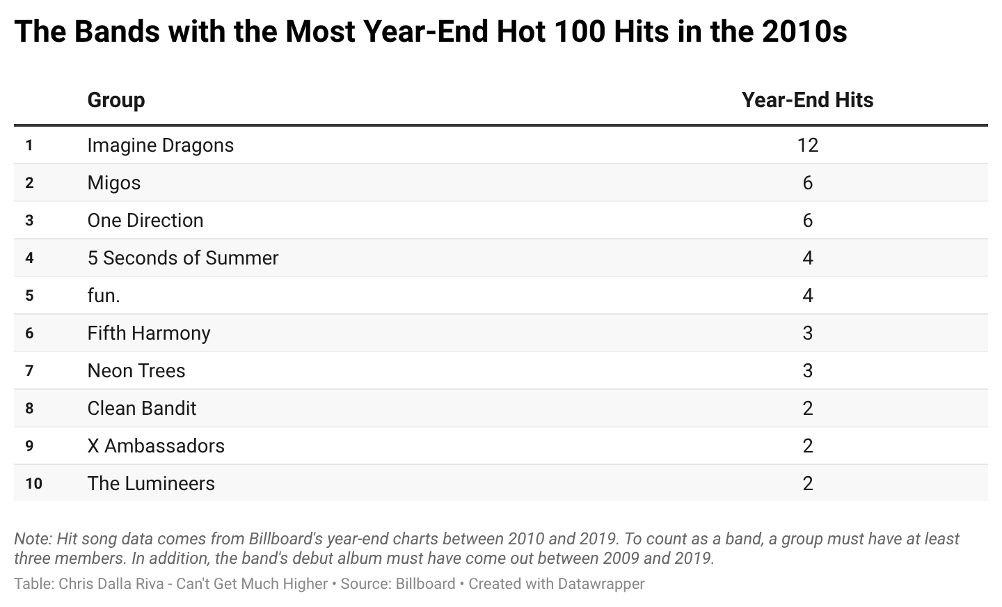 If you turn to Billboard’s year-end charts from 2010 to 2019, Imagine Dragons scored 12 hits as a lead artist, more than any other group. Migos, coming in second place, only had 6.