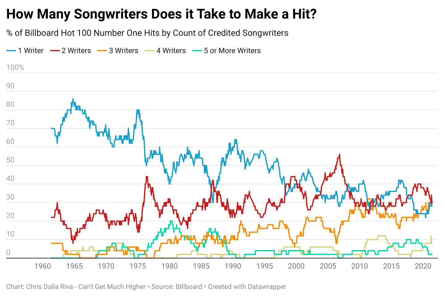 Solo songwriting is a thing of the past. Since 1960, we have seen solo credits on number one hits decline steadily, while teams of two and three songwriters have become much more common.