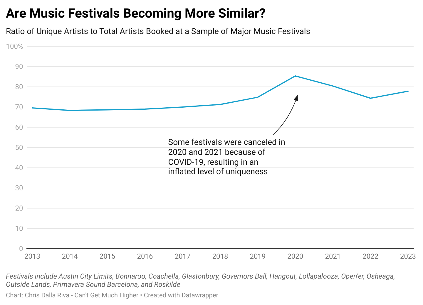 Now, let’s turn back to the important question at hand: Are major music festivals booking the same acts more frequently? The simplest way to answer this question is to look at a uniqueness rate, meaning what percentage of artists were booked at exactly one of the 12 festivals in any given year. The answer: most.