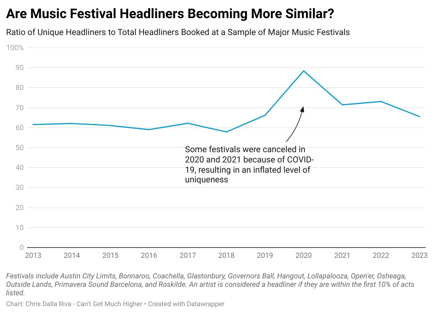 What about headliners, though? Do they tell a different story? Somewhat. Four of 12 festivals saw the uniqueness rate for their headliners decrease between 2013 and 2023. Furthermore, headliner uniqueness is notably lower than all lineup uniqueness. In fact, some festivals — like Osheaga in 2016 — had no unique headliners within a given year.