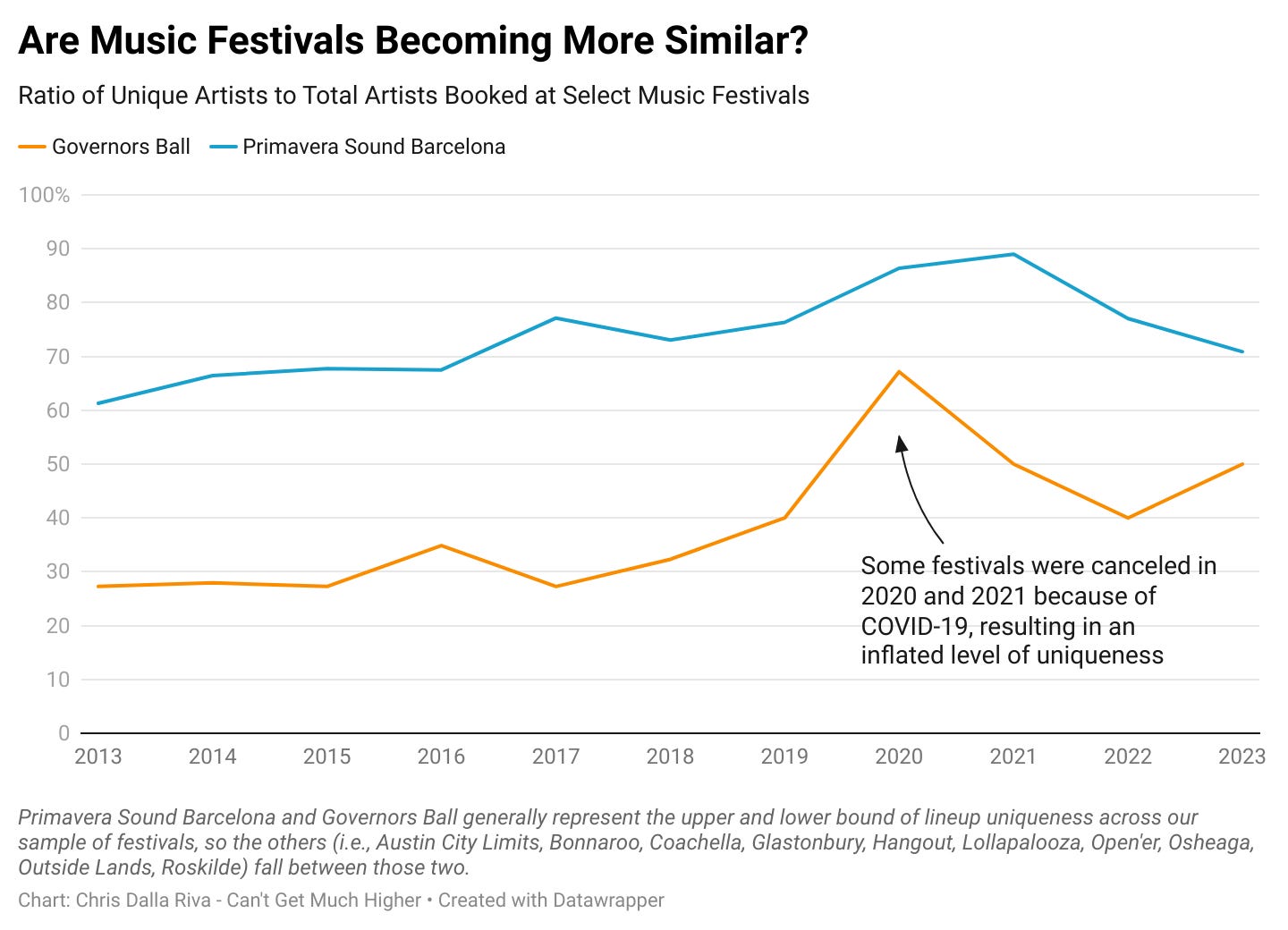 One way that I thought my analysis could be biased is if larger festivals booking tons of unique acts is drowning out the homogenization of smaller festivals. To try to understand if this was the case, I took Primavera Sound Barcelona — the largest, most unique festival — and compared it to Governors Ball — the smallest, least unique festival. I did this because the uniqueness rate of basically every other festival will fall between these two.