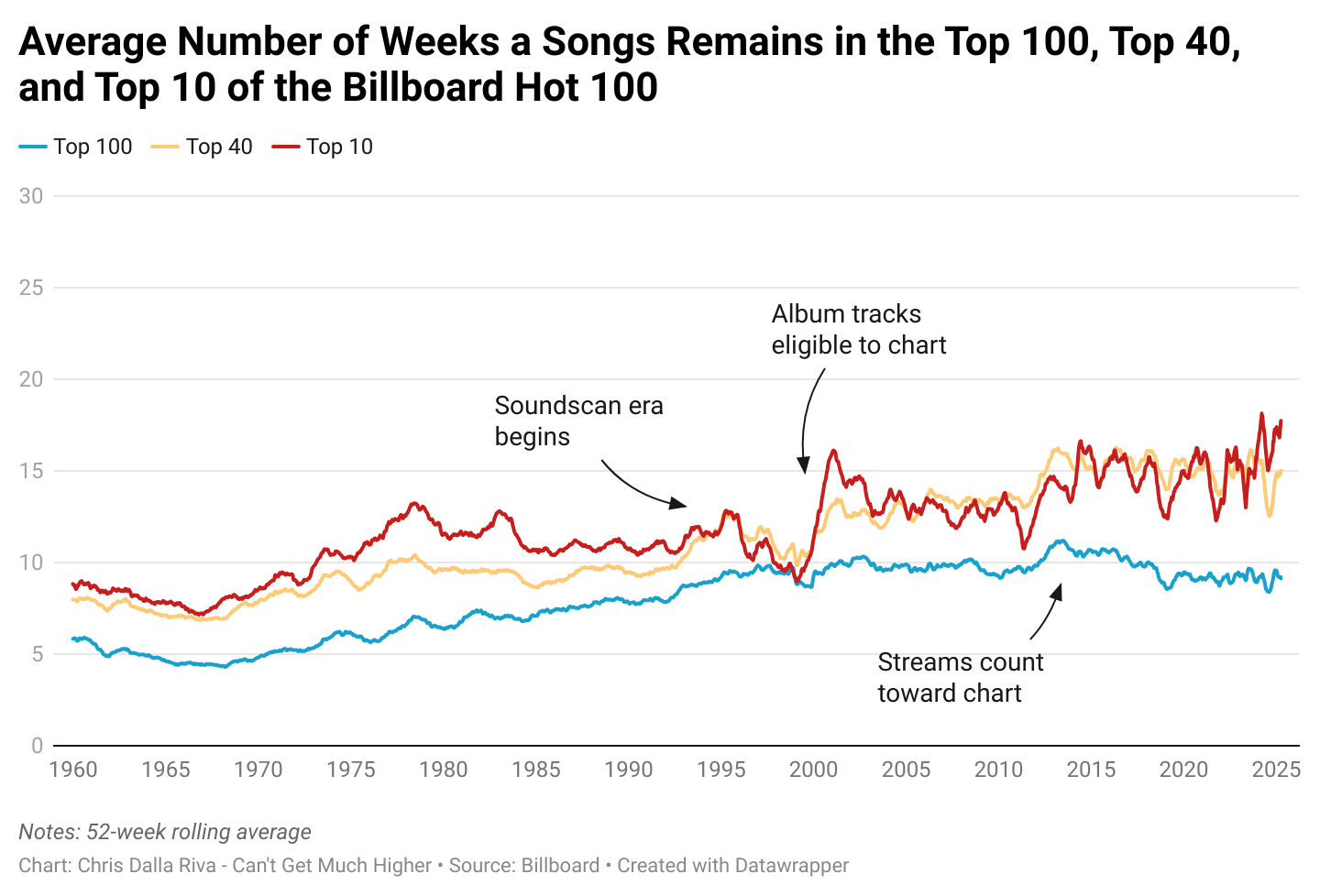 In 1960, your average song in the Hot 100 stayed on the chart for 6 weeks. Similarly, your average song that made the top 40 stayed there for 8 weeks, and your average song to make the top 10 stayed there for 9 weeks. In 2025, your average song stays in the Hot 100 for 9 weeks, the top 40 for 15 weeks, and the top 10 for 18 weeks. These are big changes. For example, the average stay in the top 10 is up 100%. Why? To understand, we need to dig into a few notes I’ve added to these charts.