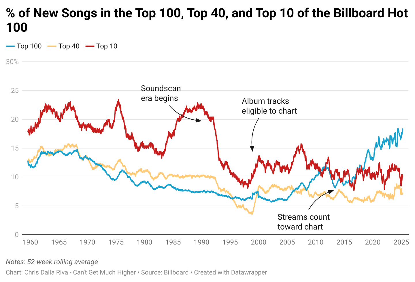 In 1960, 12% of songs on the Hot 100 were new within your average week. Similarly, 13% were new in the top 40, and 18% were new in the top 10. In 2025, things have shifted. 18% of songs on the Hot 100 are new within your average week. Similarly, 7% are new in the top 40, and 10% are new in the top 10. What does this mean?
