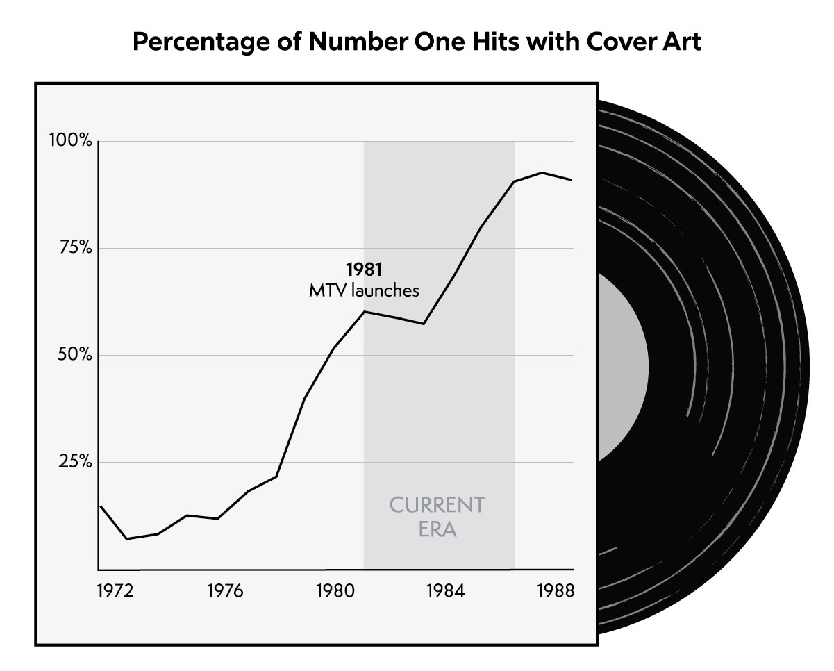 As you can see in Figure 7.5, there was a growing interest in single cover art before this era, but its use became commonplace as the importance of MTV and image grew. I spoke to both Joel Whitburn and Fred Bronson, two leading authorities on the Billboard charts, and they concurred that this finding goes beyond the number ones. Single cover art wasn’t prevalent until the 1980s.