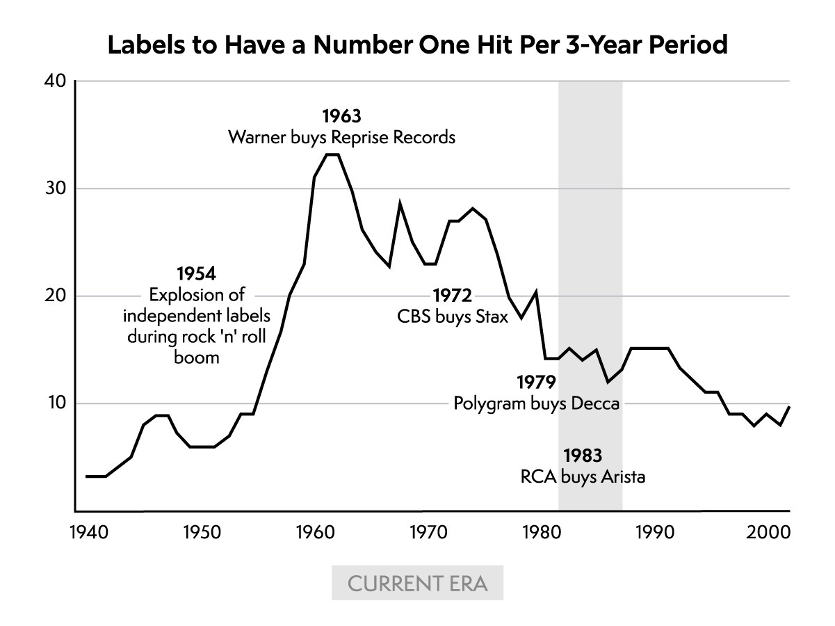 In the first half of the twentieth century, the music industry was dominated by three labels: RCA, Columbia, and Decca. Some of their power came from the fact that they had created technology that was required to record and manufacture music. Then around 1950, there was an explosion of independent labels. As noted in Chapter 3, this explosion was driven by the economic boom after the Second World War, along with the emergence of the teenage demographic. You can see this in Figure 7.4. Between 1943 to 1945, every number one was released by one of four labels. From 1961 to 1963, that number had jumped to 33. By the end of that decade, the reconsolidation began, though.