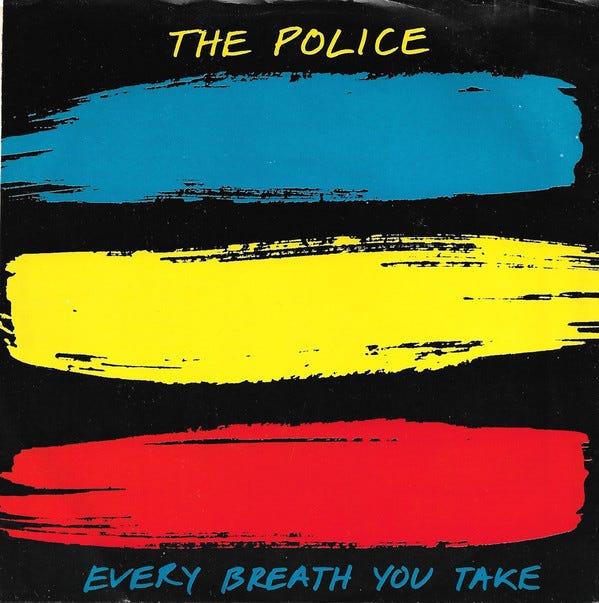 And if that wasn’t cheap enough, sometimes the label would repurpose the artwork they were using for the album the song belonged to. For example, Phil Collins’ droning “One More Night” (March 30, 1985) and The Police’s sultry, stalker-anthem “Every Breath You Take” (July 9, 1983) are modified artwork from the former’s No Jacket Required and the latter’s Synchronicity.