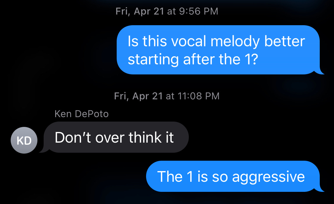 Another detail that I couldn’t stop thinking about was on which beat the verse melody should start. In the demos that I’ve included here, it started on the and of one. That’s musical parlance for just after the first beat. But now I was thinking about starting it directly on the one. I decided to consult Ken on the matter.