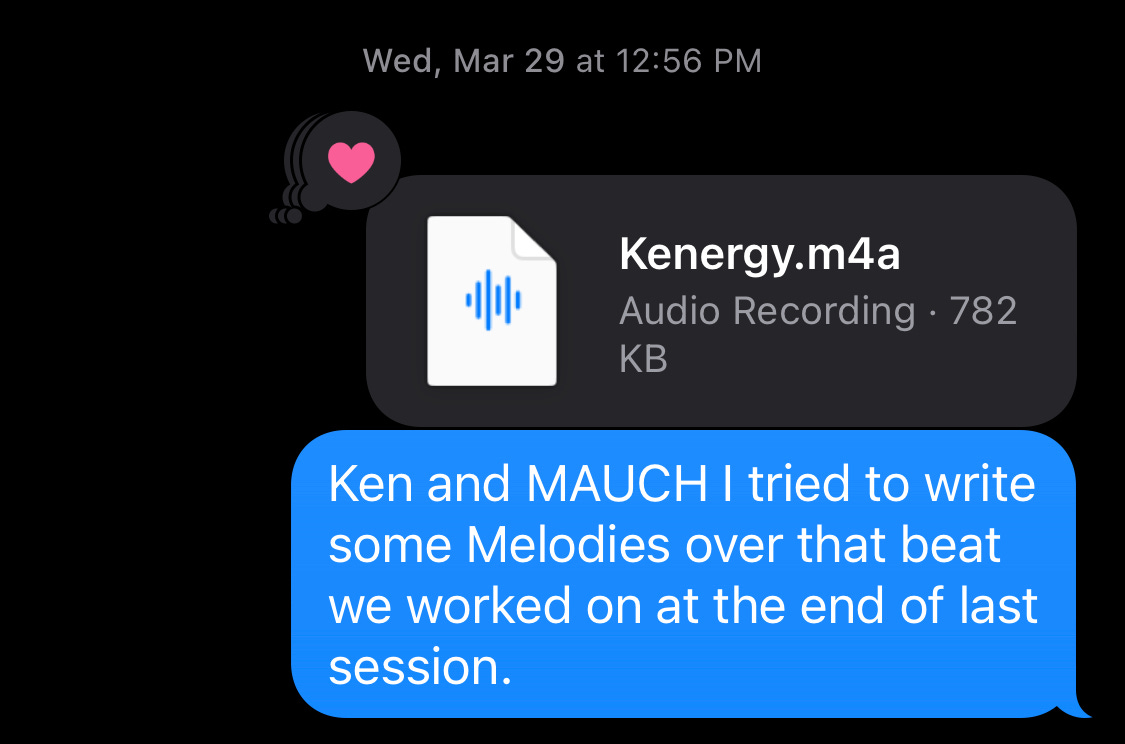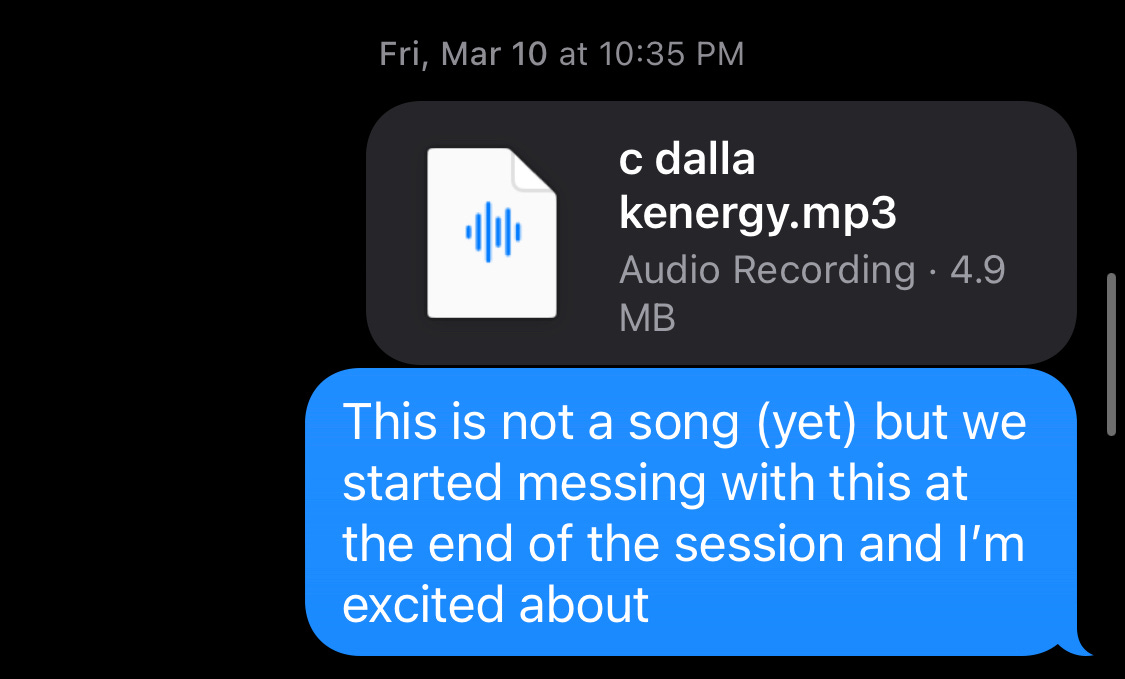 With that, the session was over. Max emailed me the file - jokingly named “Kenergy,” an ode to our collaborator - and then I was on my way. I was jazzed. I sent the audio to a few friends accompanied by a text like the one below.