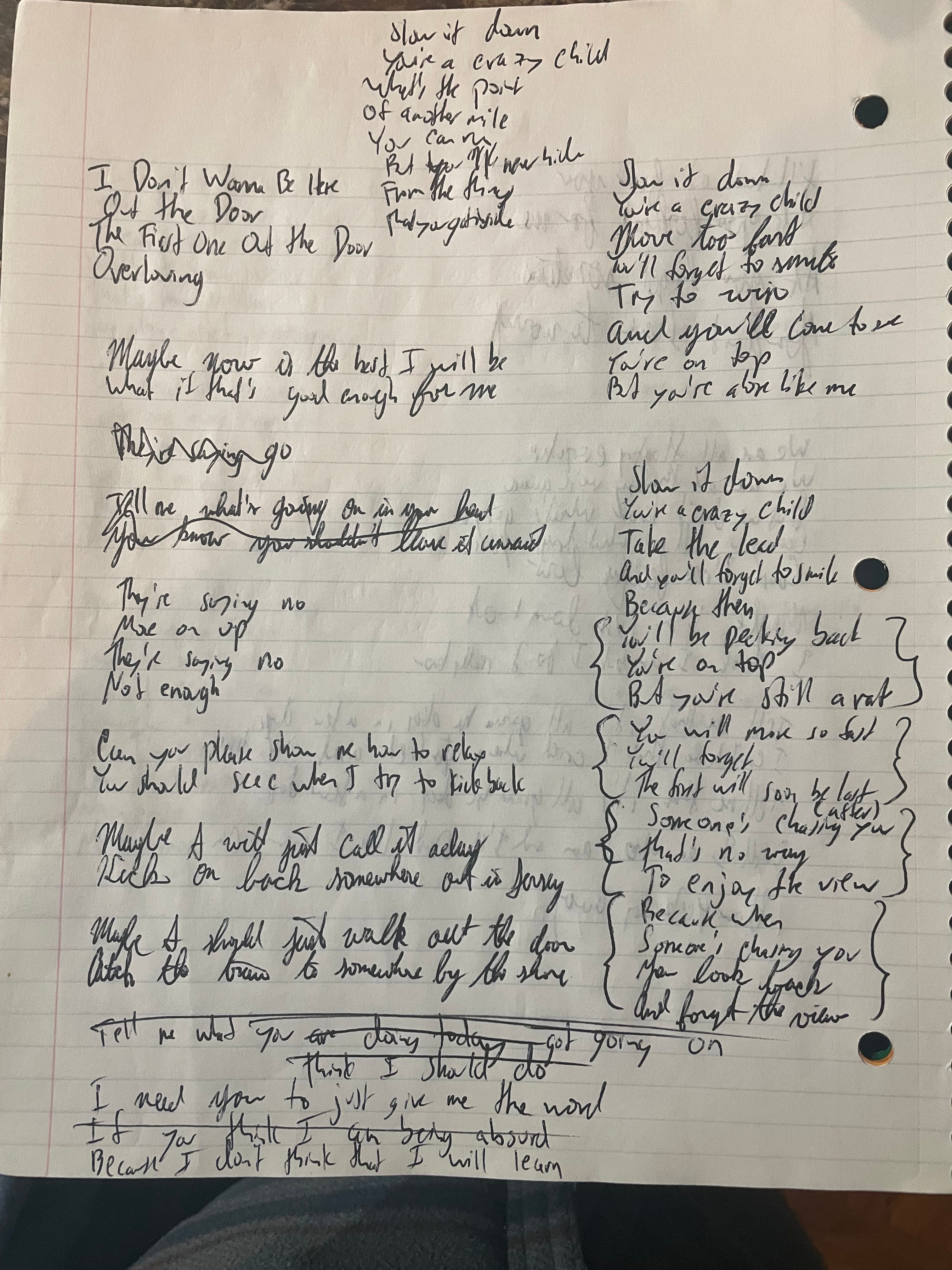 On the top and the right, I’ve written seven different versions of the bridge. I used the line “Slow it down / You’re a crazy child” - an allusion to Billy Joel’s “Vienna” - in every version, but I could not settle on the other lyrics. Here are three different versions from those drafts.