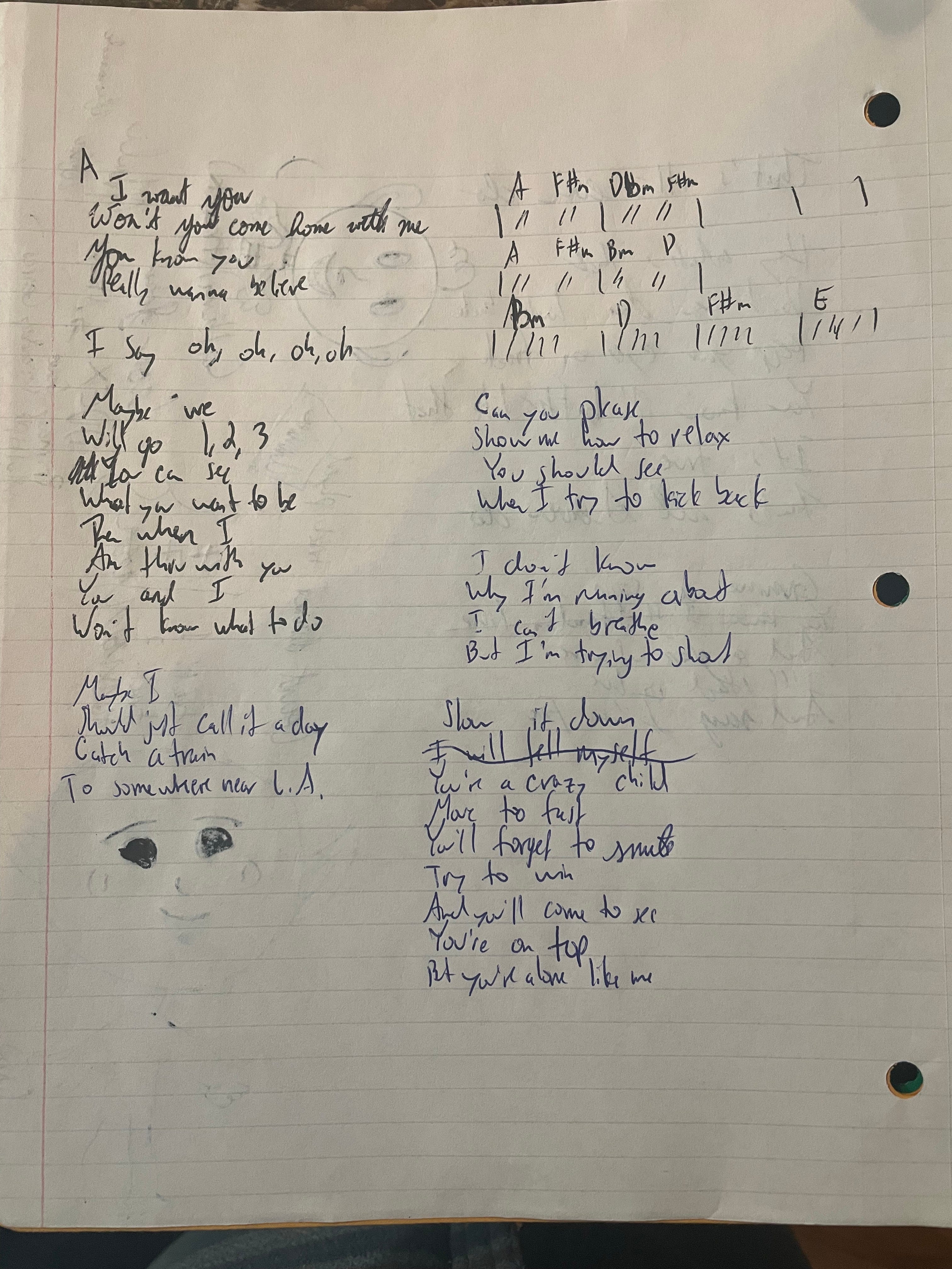 A lot of these lyrics are garbage (e.g., “Maybe we will go 1, 2, 3”). But there are also seeds of words that ended up in the song. “Maybe I should just call it a day / Catch a train to somewhere near L.A.” eventually became “Maybe I should just walk out the door / Catch a train to somewhere by the shore,” a lyric that makes much more sense given my New Jersey roots.