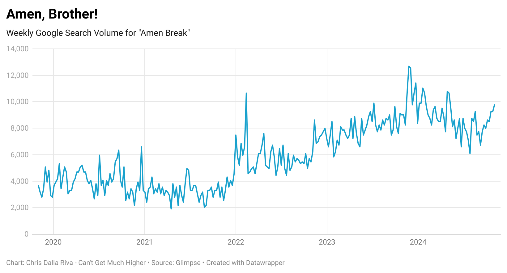 And there’s no signs of its popularity dissipating. The “Amen Break Generator (Revived)” app that I mentioned at the beginning of this piece is a simple tool to create, modify, and download the Amen Break. It’s currently one of the most popular paid apps on the App Store. Furthermore, Google search volume for “Amen Break” is at its highest volume in five years having grown 166% to around 10,000 searches per week.