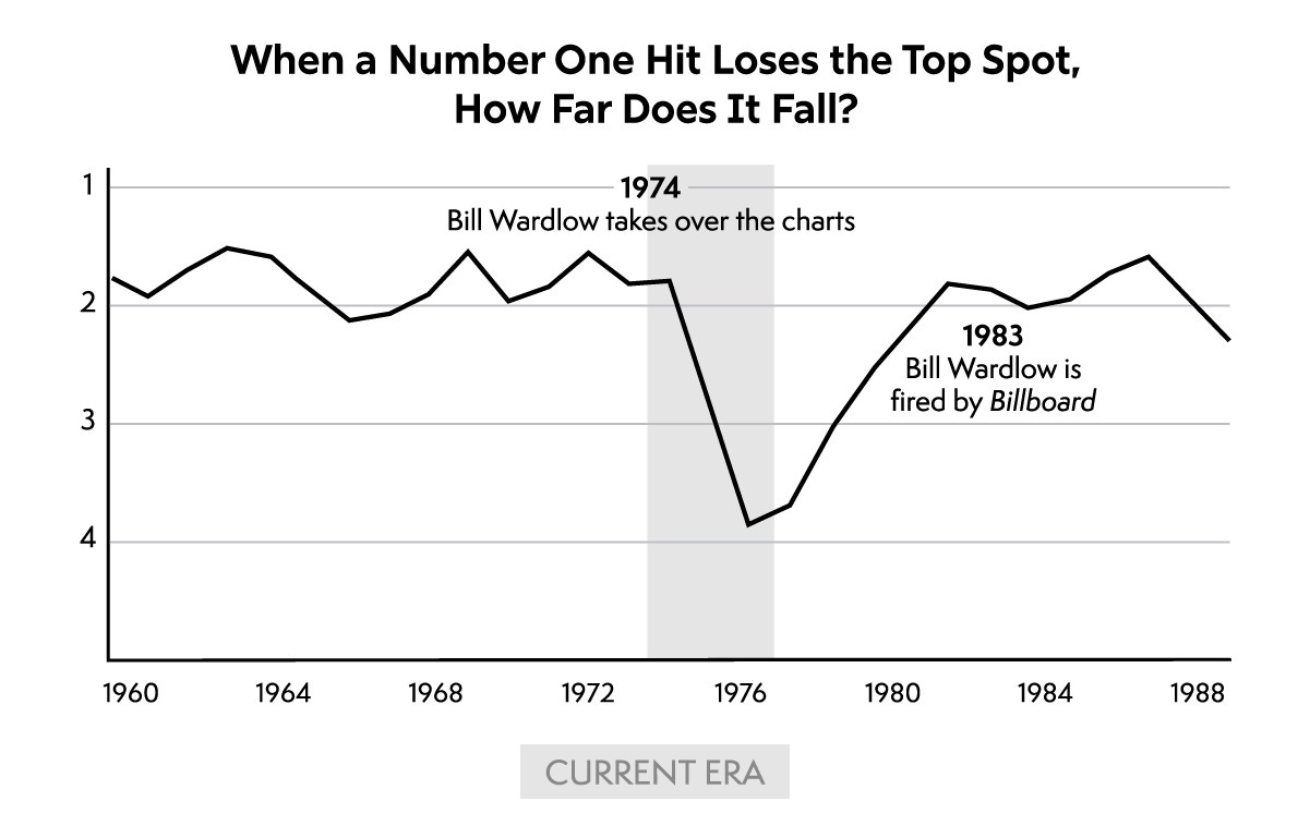 In Figure 5.2, you can see that from 1958 through most of 1974, when your average song lost the top spot, it was falling one to two slots. In this era, it was falling close to four slots before returning to the old rate of decline by the end of the decade. Something fishy was going on. And that something was Bill Wardlow.
