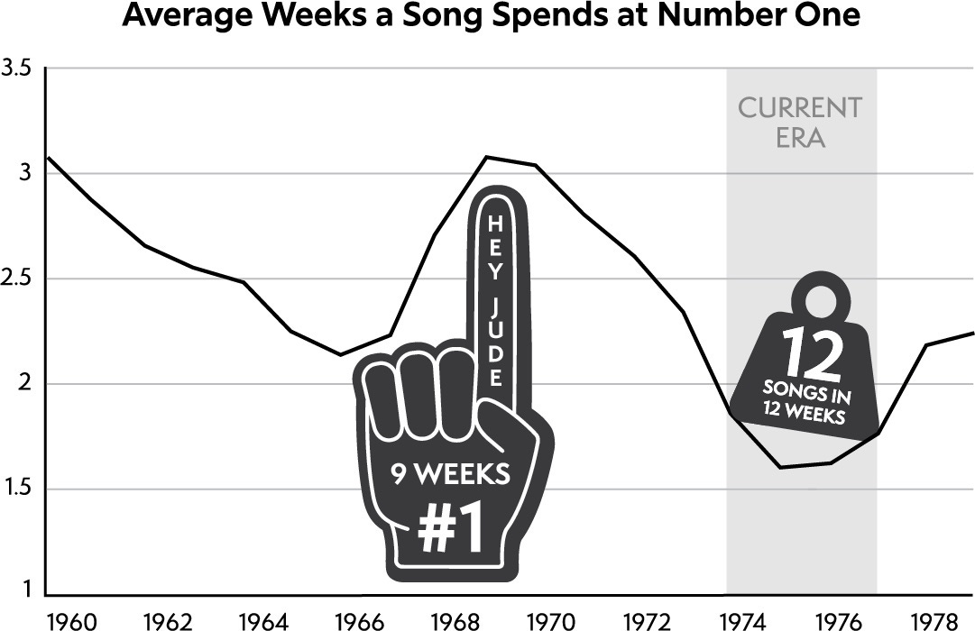 In Figure 5.1, you can see that between 1958 and 1970, number ones typically spent two to three weeks atop the charts. There was variation, but one-week chart-toppers were not common, only occurring about 27 percent of the time. Then things changed. By the middle of the 1970s, the average time atop the charts fell close to 1.5 weeks with nearly 50 percent of number ones between 1970 and 1977 only leading the chart for a single week.