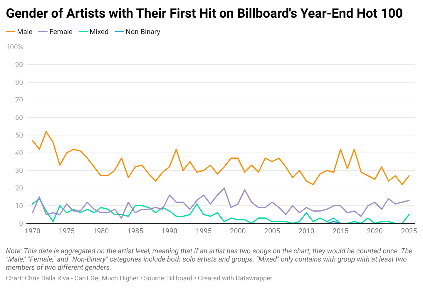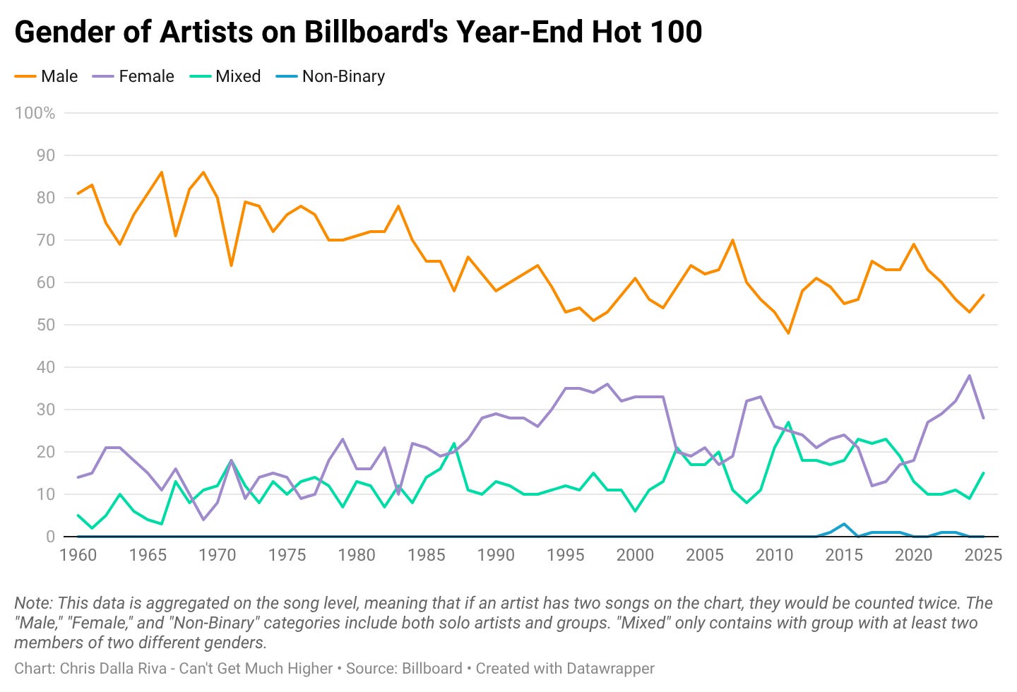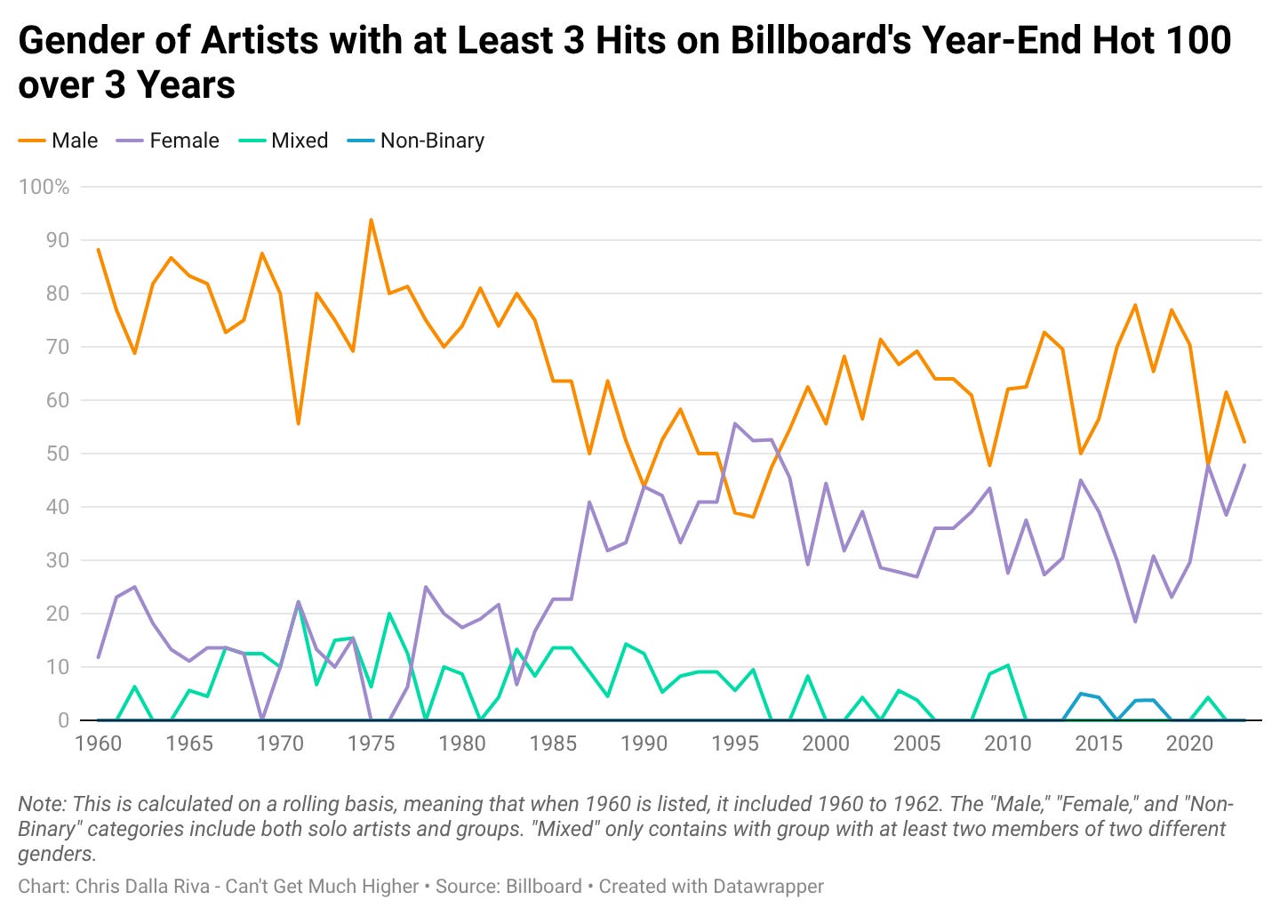 In addition, gender parity might just be making us think that there are no men in the pop world anymore. Between 1960 and 1962, for example, nearly 90% of artists with at least three hits on the year-end Hot 100 were men. From 2023 to 2025, 52.2% were men and 47.8% were women. That’s a wild change. But it also reflects growing gender equality in society. That’s not a bad thing.