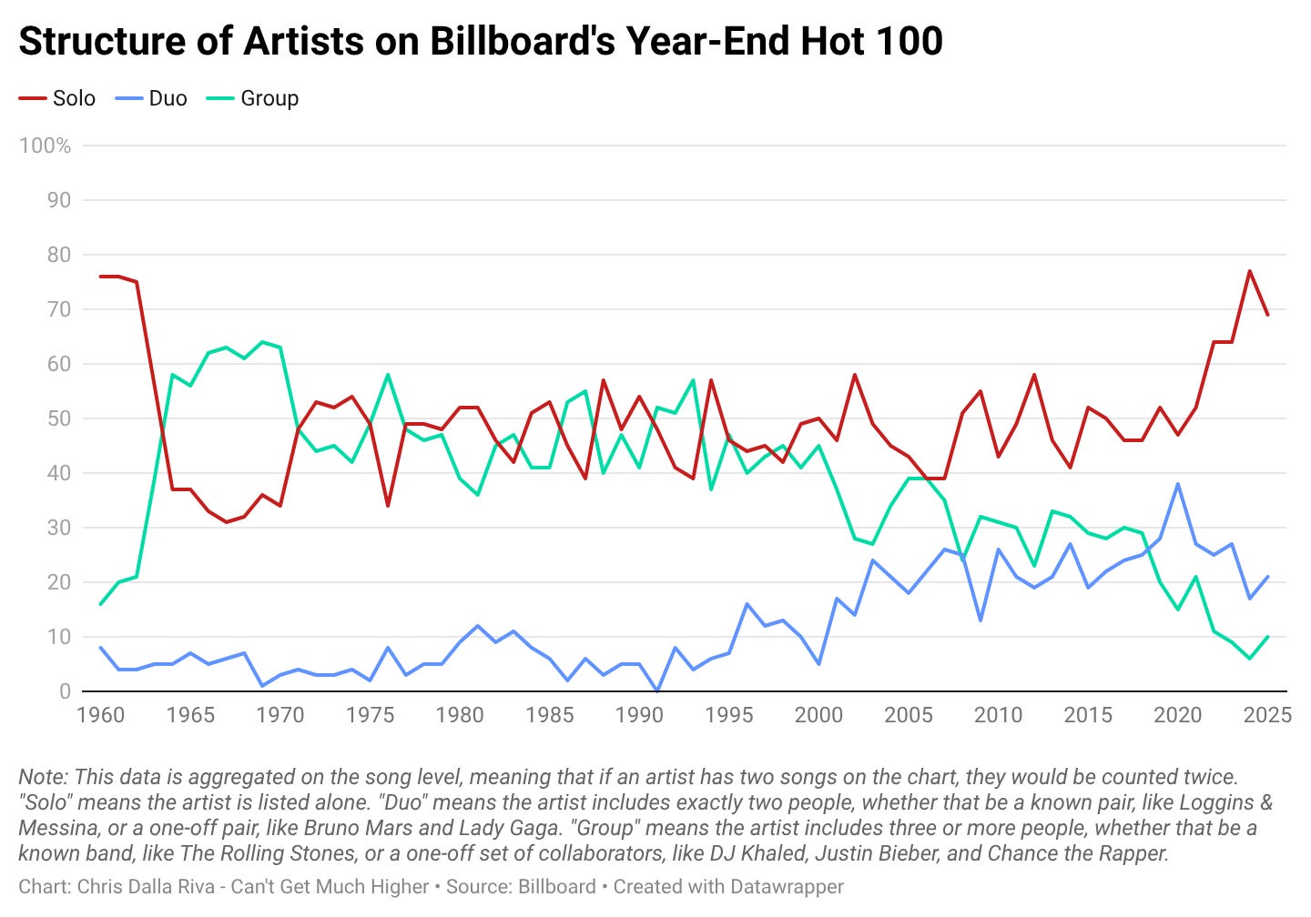 You will notice something odd about this chart, though. There has been a surge in duos over the last 20 years. What’s going on? Has the ghost of Simon & Garfunkel returned? Not exactly. There has just been an increase in solo artists duetting. Bruno Mars and Lady Gaga. Bruno Mars and GloRilla. Bruno Mars and Rosé. You get the point. If you’re looking to do another duet next year, Bruno, please give me a call.