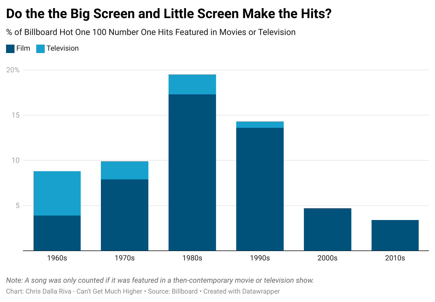 I have a dataset of every Billboard Hot 100 number one hit from 1958 through 2022. One thing I took the time to track while building that dataset was if the hit song was featured in a then-contemporary film or television show.