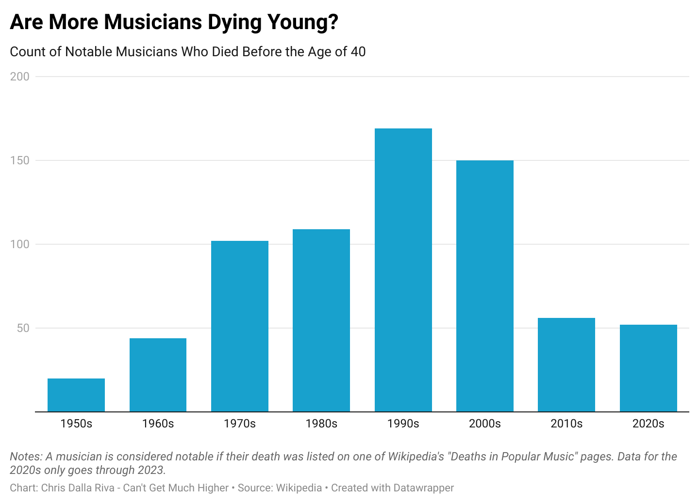 When looking at raw death counts, notable musicians dying before their 40th birthday happened most frequently in the 1990s. Luckily, the last two decades have actually been the least grim since the 1960s.