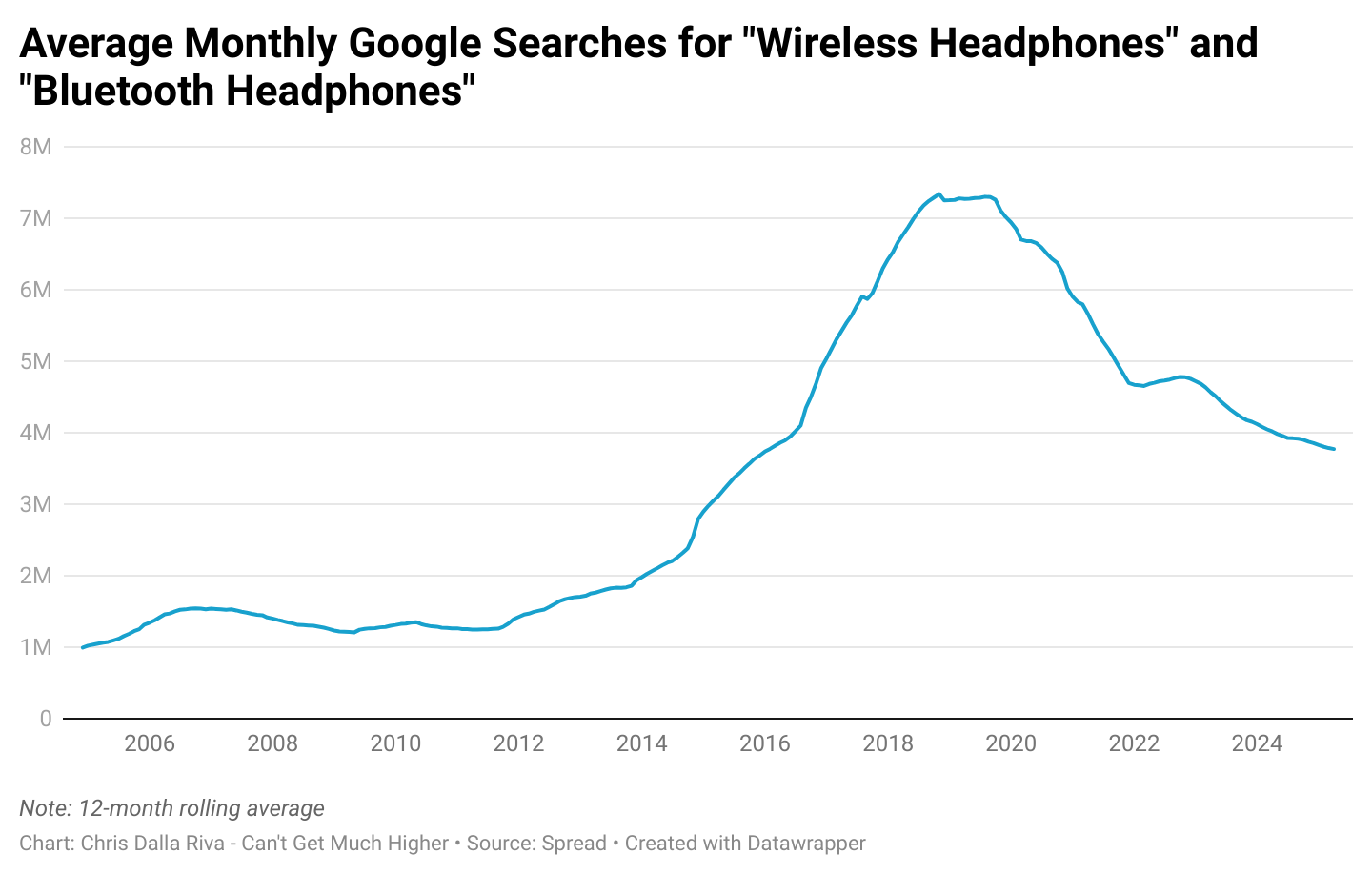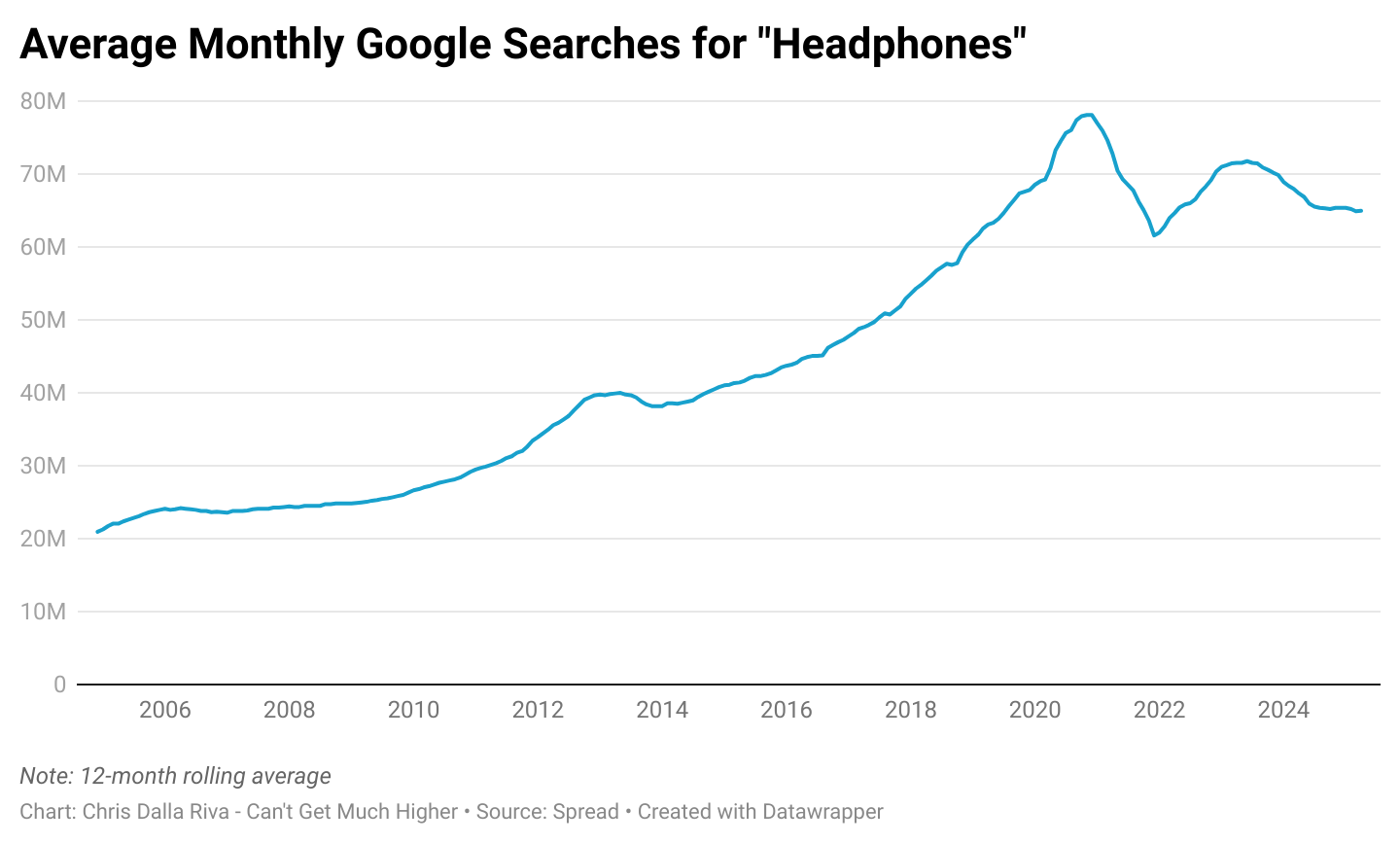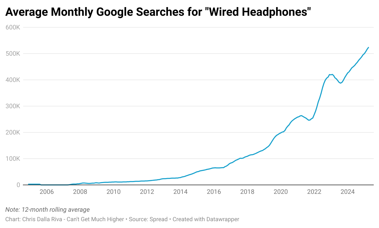 The good news is that if you compare the first three months of 2025 to the first three months of 2020, there’s been a 180% increase in Google searches for “wired headphones.” That’s great, especially if people are tired of the wireless world that most smartphones have pushed us into. What’s not great is that that growth doesn’t yet compensate for the decrease in searches for “wireless headphones” and “bluetooth headphones.” While we wait for this gap to close, please save your out-loud video watching for the confines of your home. I’m begging you.