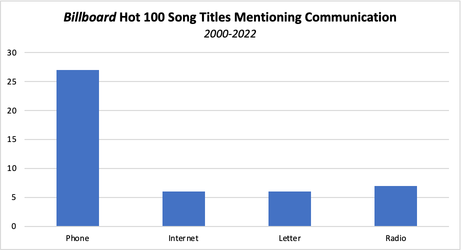 Despite the fact that the length of the numbers and the underlying technology have evolved, telephones have remained astonishingly present in the minds of songwriters. Looking beyond strings of hyphenated digits, there have been 62 songs to chart on the Billboard Hot 100 between 1958 and 2022 that have mentioned phones and phone calls in their titles. That dwarfs any other mode of communication that I looked at. Furthermore, the phone remains popular even if we focus on the post-2000 period.