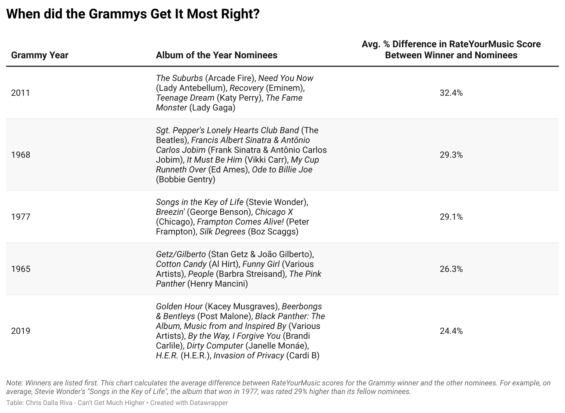 I got in an argument last week. As is typically the case for me, it was about an important topic: the best year for Album of the Year at the Grammys. Since my friend and I couldn’t come to an agreement, I figured a newsletter about music and data was the best place to resolve it. Luckily, I write one. We decided the loser owed the other a beer. Data, don’t fail me now! As always, this newsletter is also available as a podcast. Listen on Spotify and Apple Podcasts or click play at the top of this page.