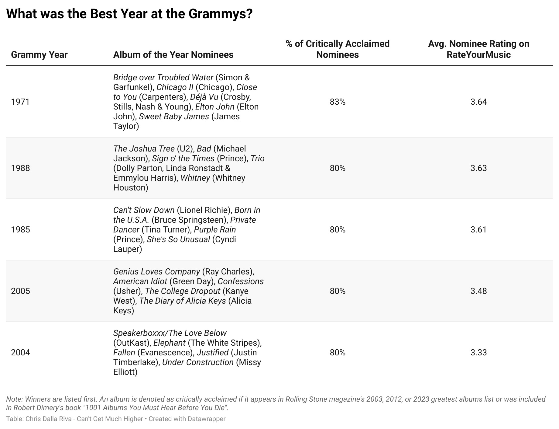 To close, I’ll remind you that this piece was inspired by an argument between my friend and I about the best year for Album of the Year at the Grammys. This was a high stakes argument. The loser has to buy the winner a beer. I staked my claim on 1985. He pushed for 1988. If you scroll back to the first table in this piece, you’ll see we were both wrong. 1971 bested both of the years. That said, 1988 did come out in front of 1985. For that reason, I will be buying the beer. But I’m sure the argument will continue. You may not like the Grammys, but at least it gets people talking.