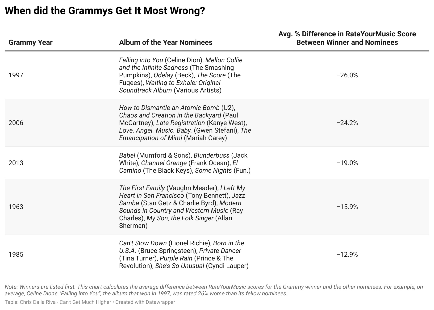 To do this, I took the average percent difference between the RateYourMusic score of the winner and the fellow nominees. For example, the score of 3.22 that Lionel Richie’s Can’t Slow Down received on RateYourMusic was on average 12.9% lower than the RateYourMusic scores of the fellow nominees. That’s not even the worst year, though. In 1997, Celine Dion’s power ballad-filled Falling into You, beat out Waiting to Exhale, the soundtrack to the movie of the same name, and three stone cold classics: The Smashing Pumpkins’ Mellon Collie and the Infinite Sadness, Beck’s Odelay, and The Fugees’ The Score.