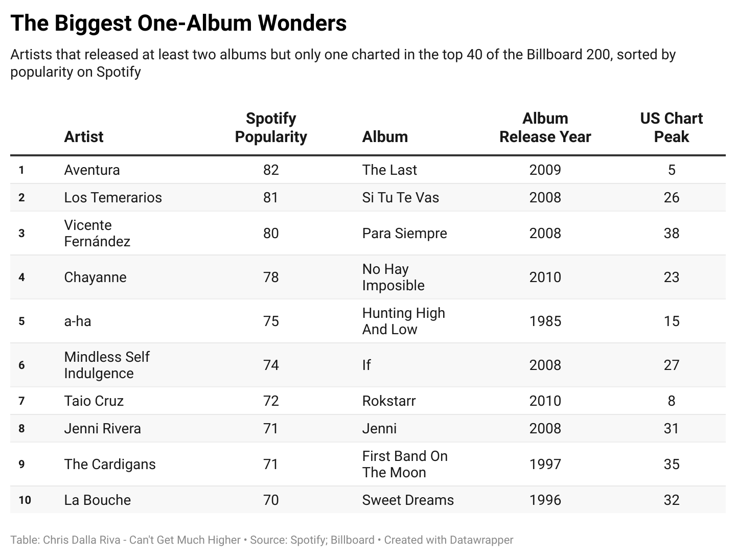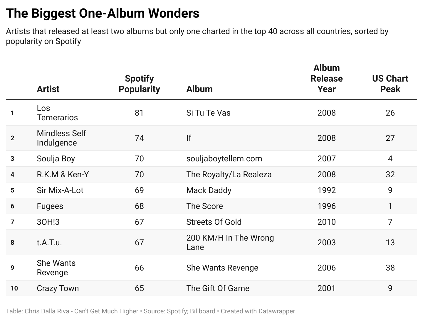 This list looks a bit better. As far as I can tell, each of these acts truly only had one top 40 album around the globe. Of course, there are still a smattering of Latin artists (e.g., Los Temerarios), but we also have representation from rappers (e.g., Sir Mix-A-Lot) and rockers (e.g., 3OH!3).