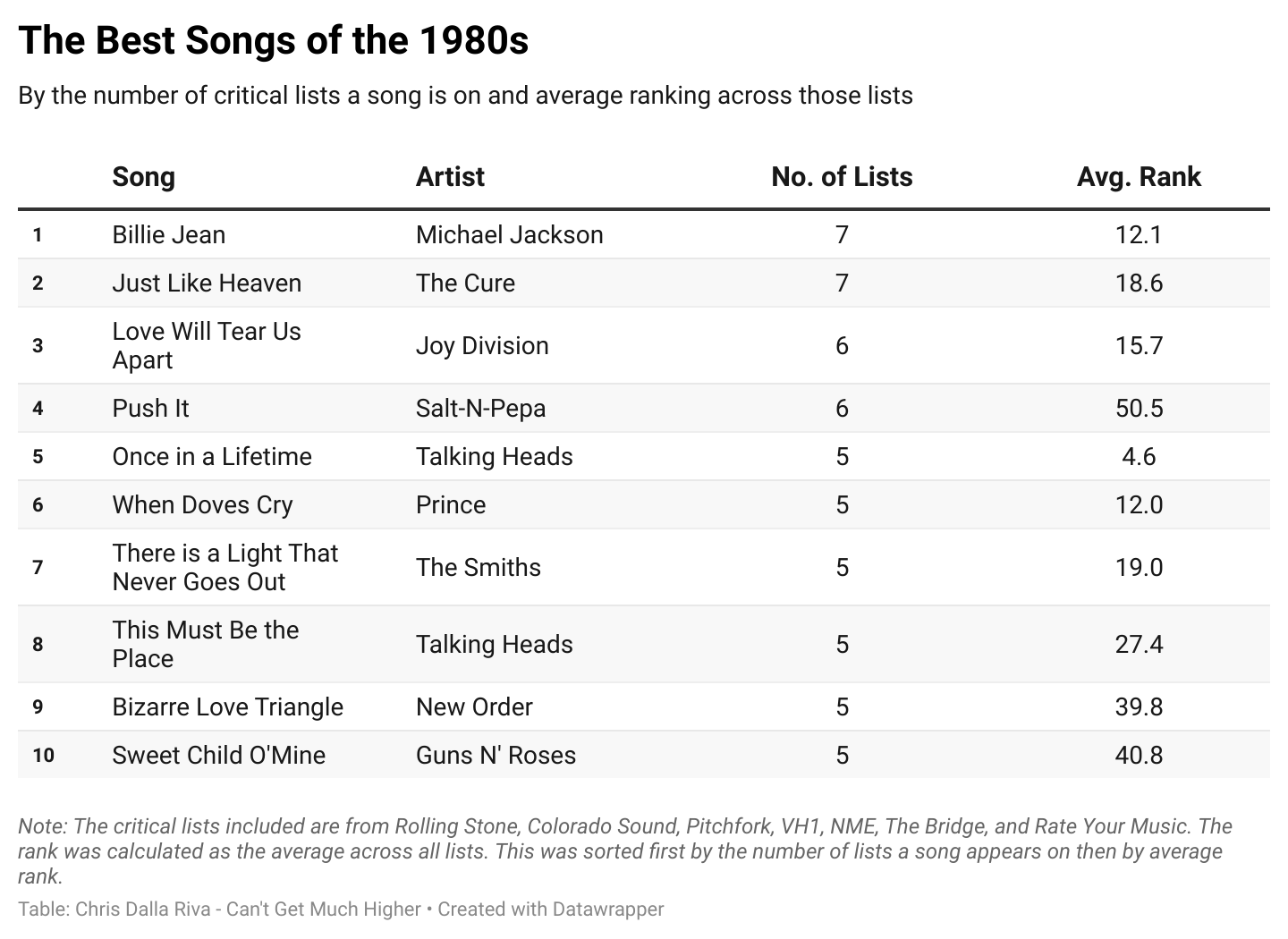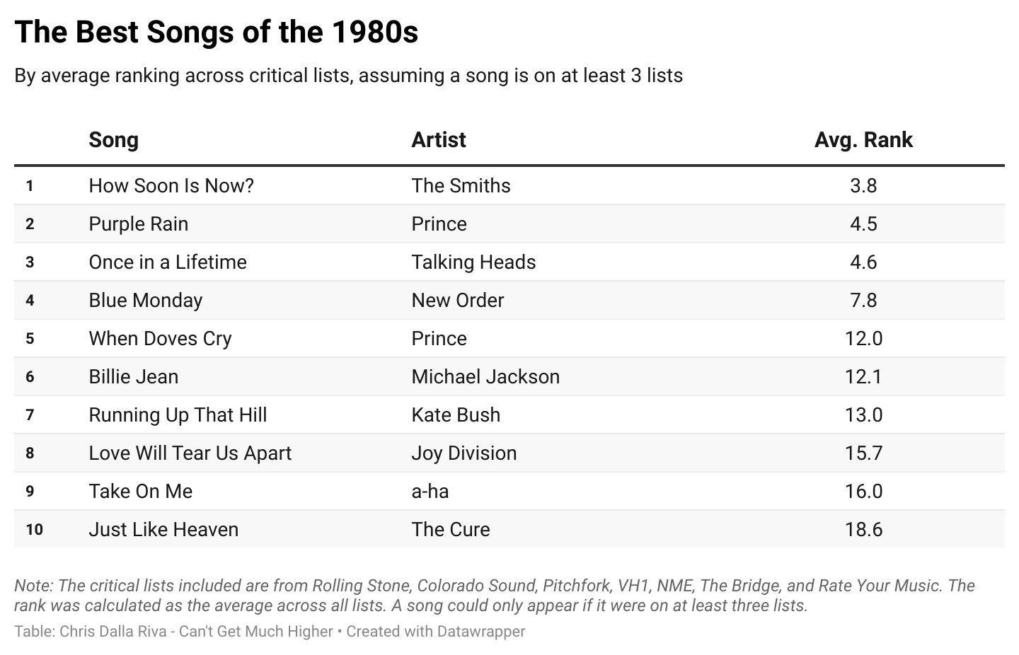 By this methodology, our list shifts a bit. “Billie Jean” falls from number 1 to number 6. By contrast, The Smiths’ “How Soon Is Now?” jumps from 15 to 1. It didn’t rank as high before because it was only on 4 of the 7 lists. But the 4 it was on all ranked it near the top. Because of that, this methodology feels a bit fairer.