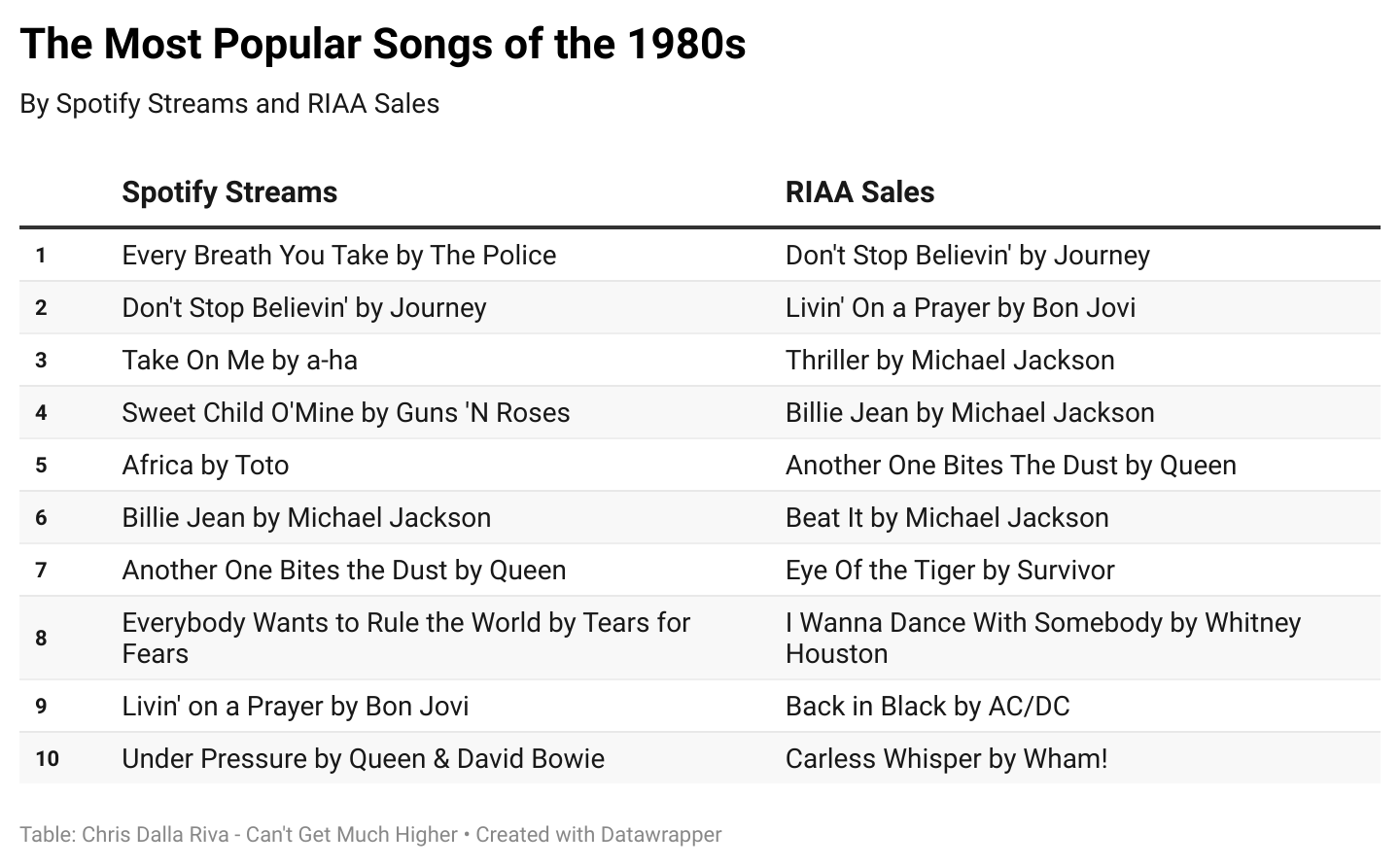 While these lists aren’t dramatically different — 4 of the 10 songs are the same — I think they illustrate distinct phenomenon. RIAA sales capture all-time popularity. Spotify streams capture the last decade-ish of listening. Even though it’s a shorter time frame, I actually think the latter is closer to what we are after. We want to know what is popular recently. We don’t care if a track sold 10 million copies in 1985 and has scarcely been played since.