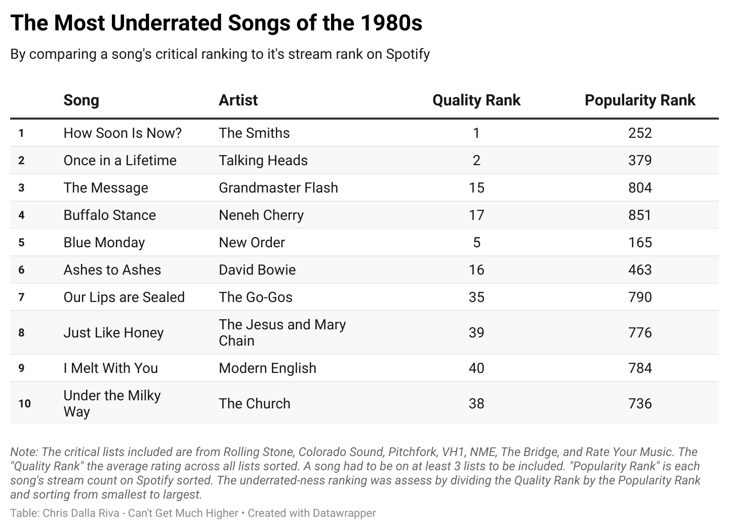 By using this methodology, the most underrated song of the 1980s is The Smiths’ “How Soon Is Now?”, which was also the highest rated song of the decade. On the surface, this may seem a bit odd. How can the best song also be the most underrated? But it makes sense when you think about how we define “underrated.”