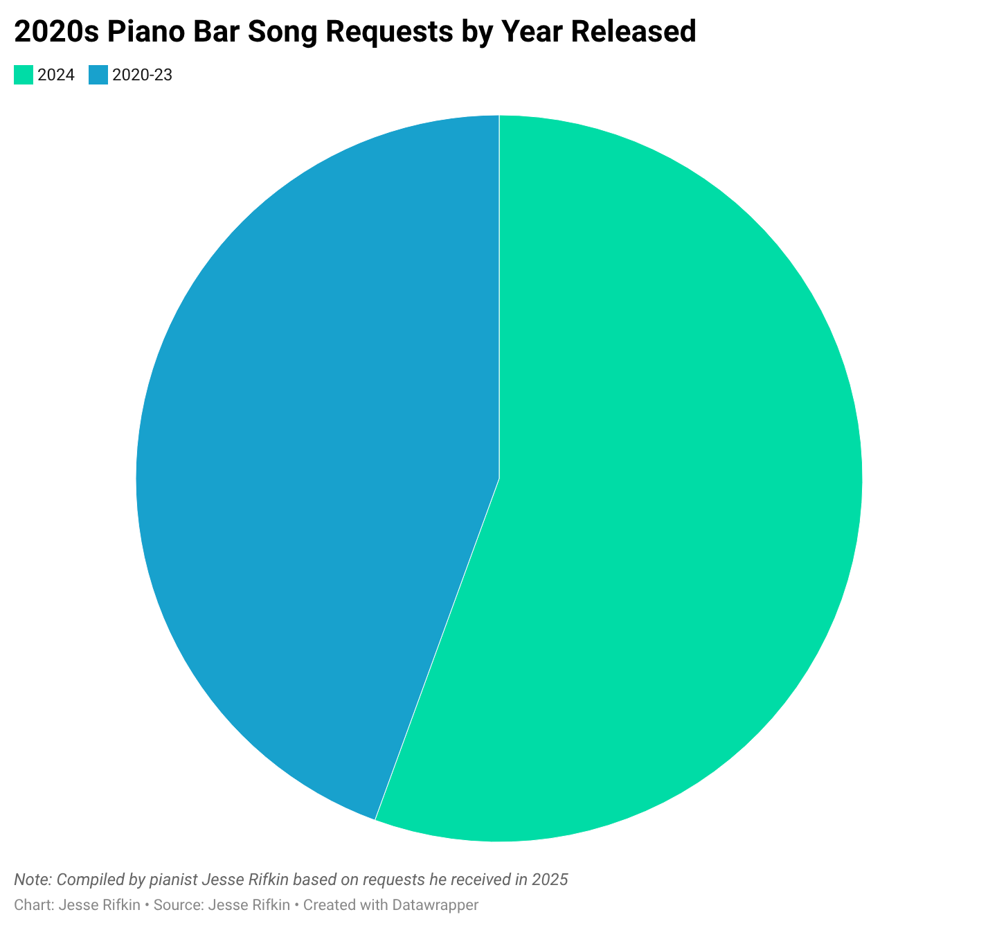 As you can see in the chart above, over 50% of requests for songs from the 2020s were from 2024. This seems to be a general pattern. Contemporary hits are always requested. But as time goes on, some of those hits are replaced by more enduring works.