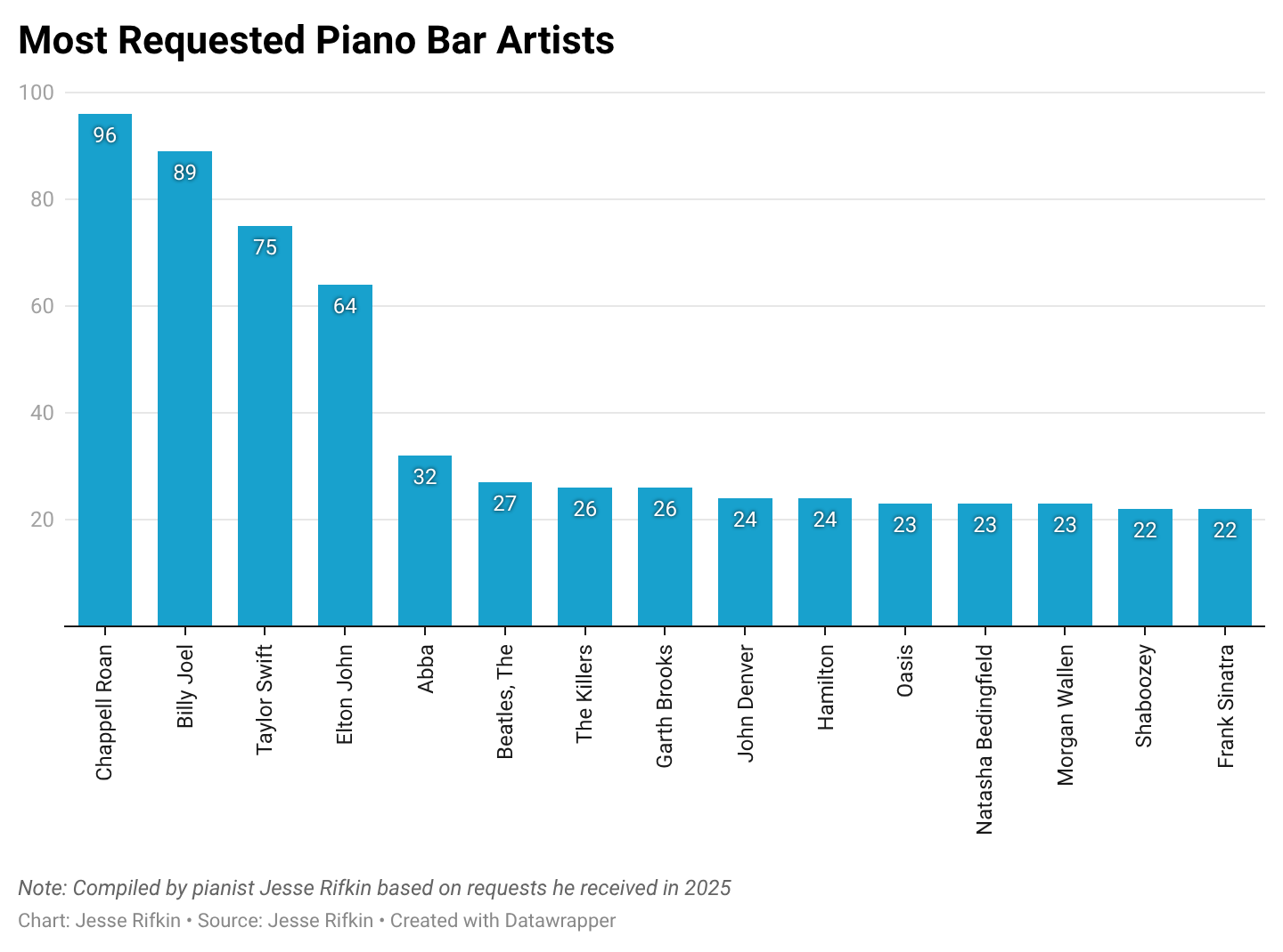 One of us, Jesse Rifkin, is a Washington, D.C. piano bar performer, headlining Georgetown Piano Bar’s dueling pianos show most Friday and Saturday nights. The other one of us, Chris Dalla Riva, is a music journalist specializing in data analysis.