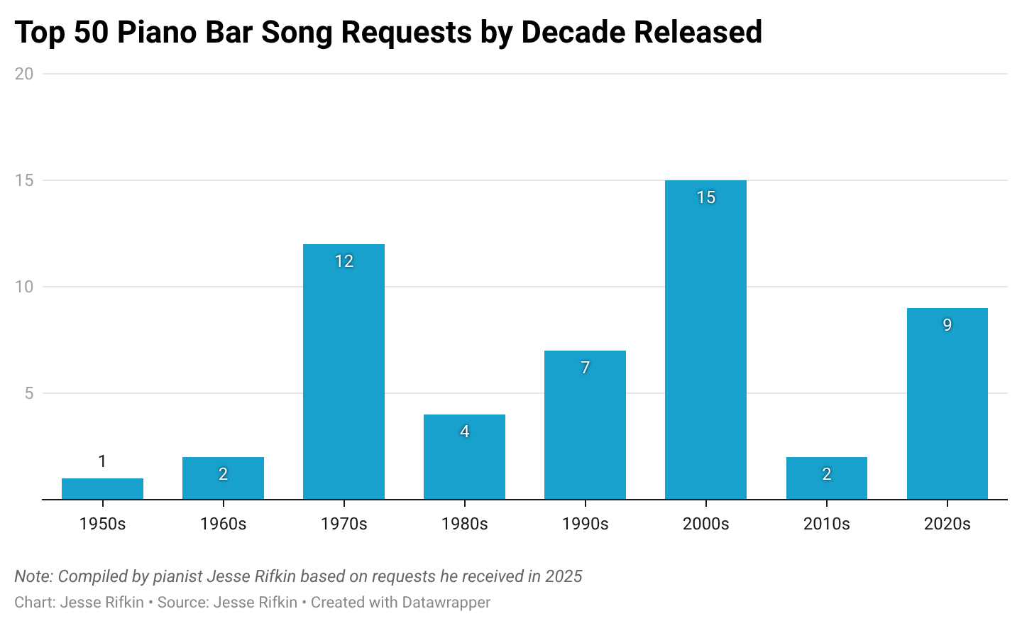 Not all older decades are represented equally, though. Only two songs from the 1960s were requested. This is odd. Many consider the decade’s second half to be the greatest period in music history. These songs just don’t seem to translate to the piano bar.