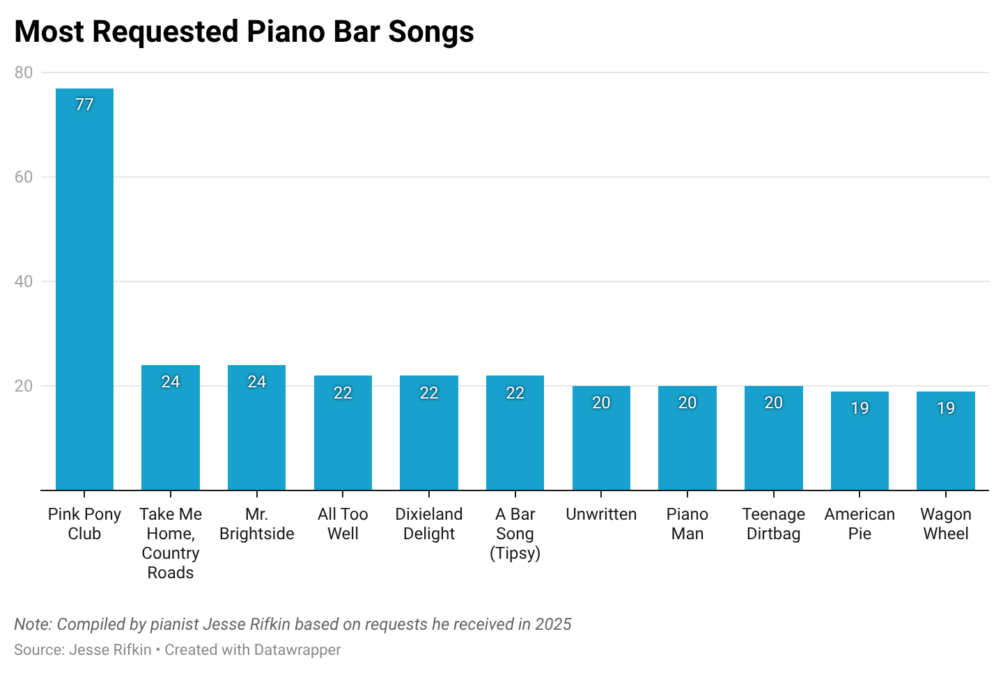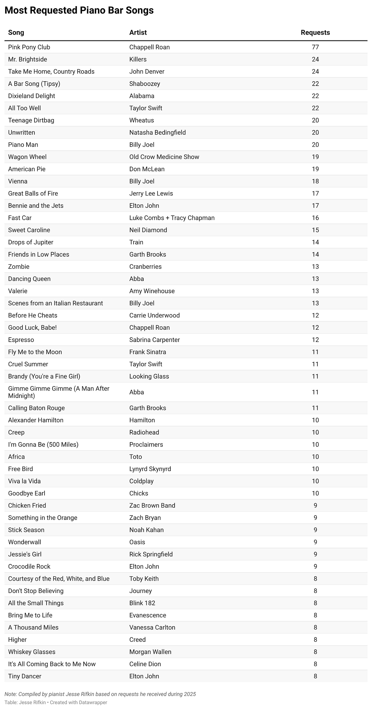 In December, Rifkin published a Washington Post opinion column about how “Pink Pony Club” by Chappell Roan recently dethroned “Piano Man” as the most requested song at his venue. After Rifkin’s column published, Dalla Riva said that he’d love to see a dataset of all Rifkin’s piano bar song requests.