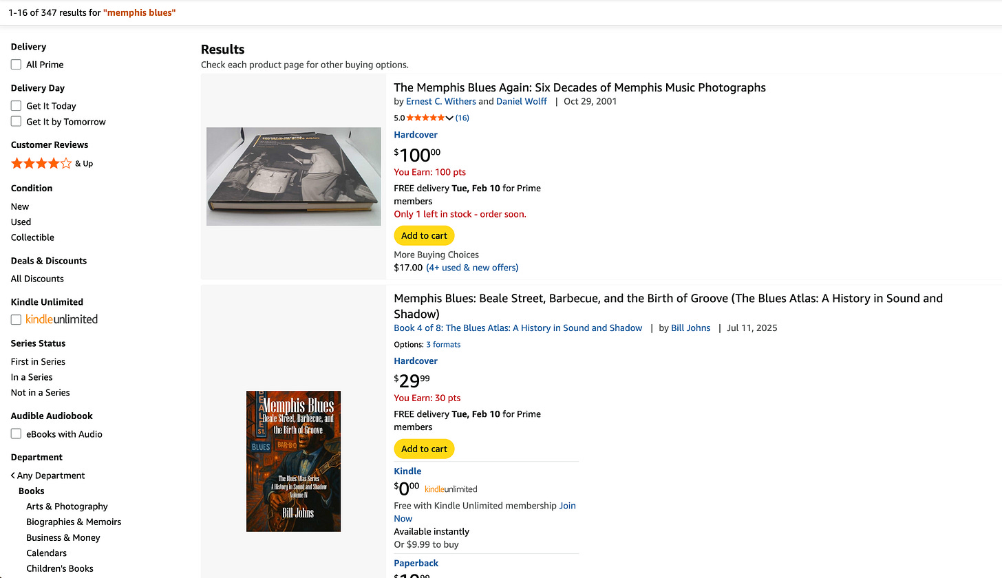 If you go on Amazon and search for books about the Memphis Blues, the first result will be The Memphis Blues Again: Six Decades of Memphis Music Photographs by Ernest C. Withers and Daniel Wolff. The second result will be Memphis Blues: Beale Street, Barbecue, and the Birth of Groove by—you guessed it—Bill Johns. In other words, if you are trying to learn about something, you might end up accidentally lining the pockets of Bill Johns.