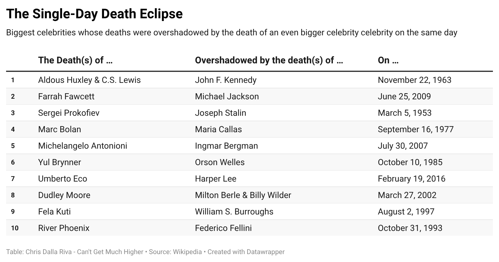 This got me wondering if there was an even more extreme example of this phenomenon. Was there a day with an even bigger celebrity death, one that would have dominated the news, totally overshadowed by someone even larger passing? I decided to take a look.