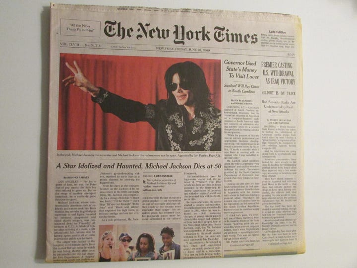 Fawcett was a major star, but Jackson took up headlines that day. His death was the top story in The New York Times. Fawcett’s death did make the cover, albeit on the bottom is significantly smaller text.