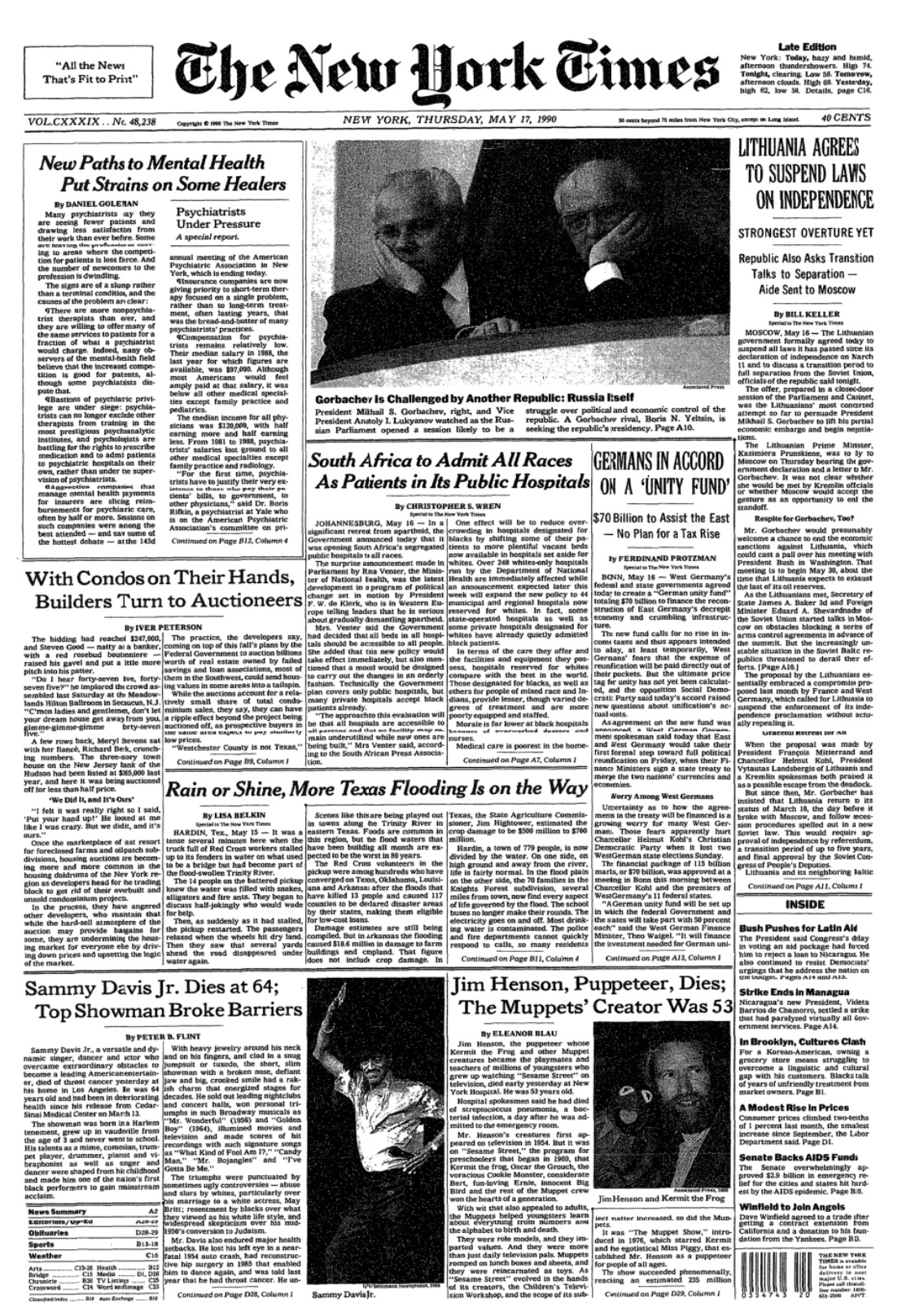 Of course, deaths don’t necessarily have to overshadow one another if they occur on the same day. The entertainer Sammy Davis Jr., for example, died on May 16, 1990, the same day as The Muppets creator Jim Henson. I’m sure the unexpectedness of Henson’s death took some of the spotlight away from the “I’ve Got to Be Me” singer, but they both got similar coverage in the paper.
