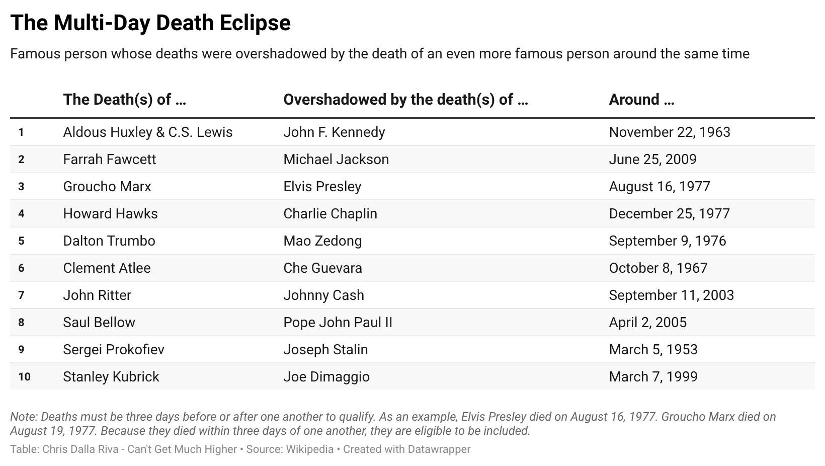 Honestly, that last pair illustrates a general pattern I am seeing in this data. The most likely way a death is overshadowed is when a pop culture figure dies right around the same time as a major political or religious figure. It’s not even clear to me if the opposite has ever been the case.
