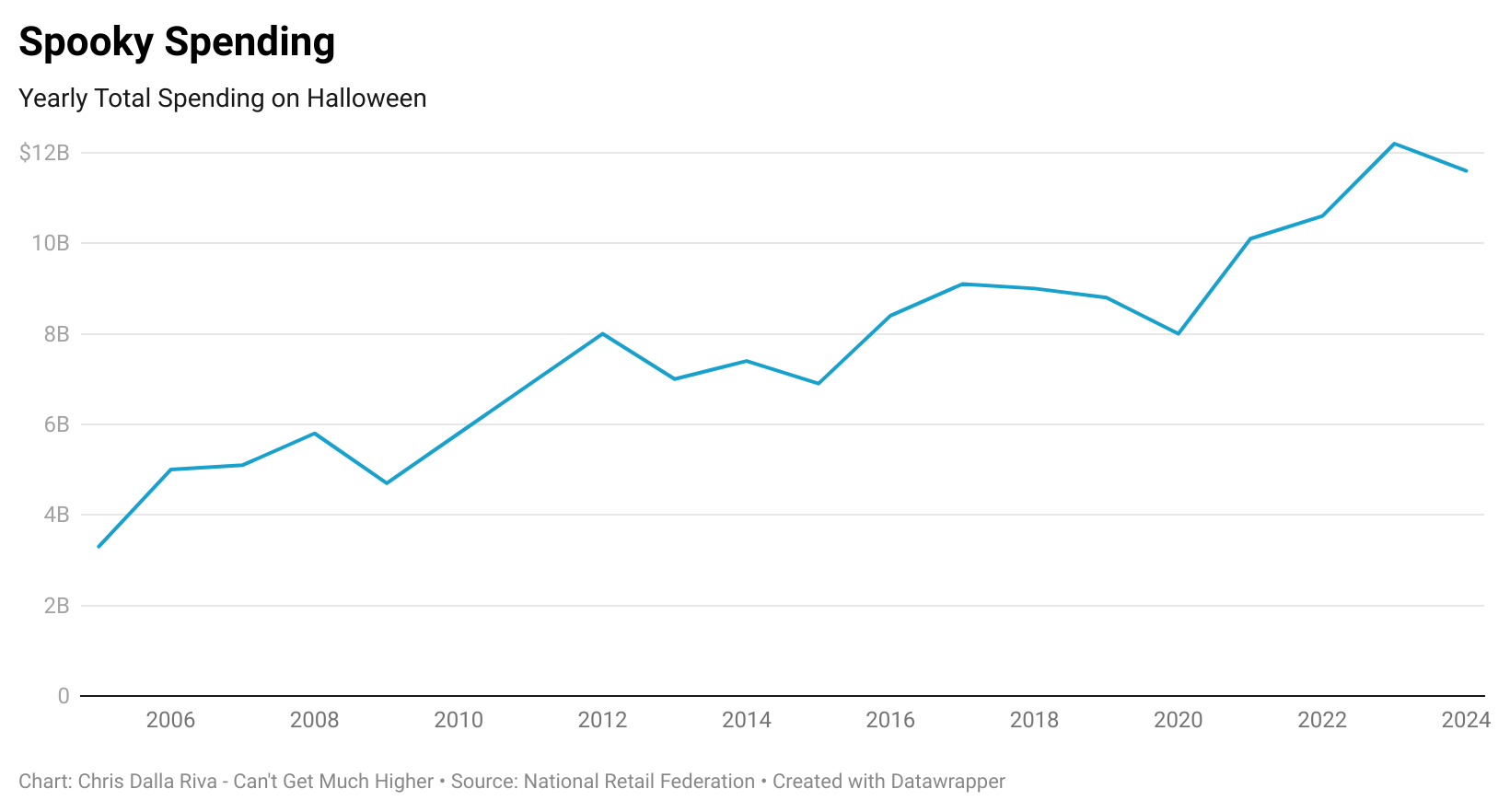 This adult passion for all things ghastly and grisly has led to something else that has gotten the music industry excited: spending. According to the National Retail Federation, spending on Halloween has grown from $3.3 billion to $11.6 billion between 2003 and 2024. Where there is money being spent, there are music executives somewhere trying to figure out how they can get some of the spoils.